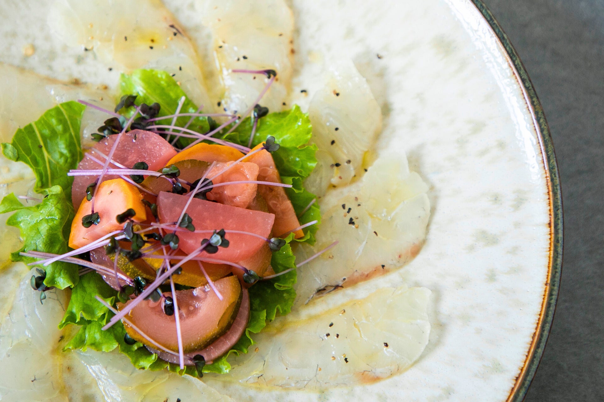 白身魚 40g、ズッキーニと大根のピクルス 1本、グリーンリーフ 適量、レッドキャベツスプラウト 適量、オリーブオイル 適量、塩 適量、コショウ 適量