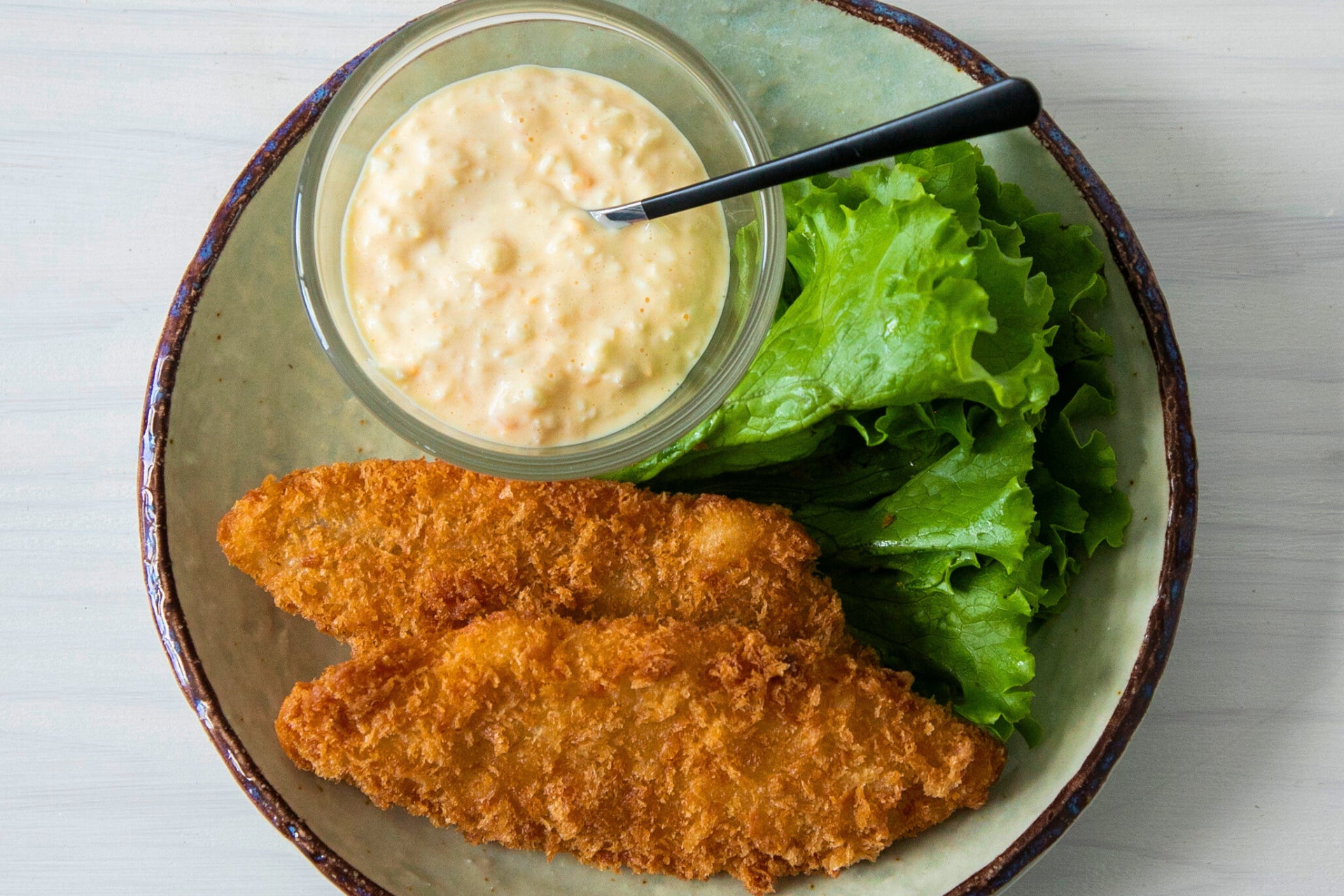 (4)白身魚のフライに(3)の特製タルタルソースを添えて、完成です。