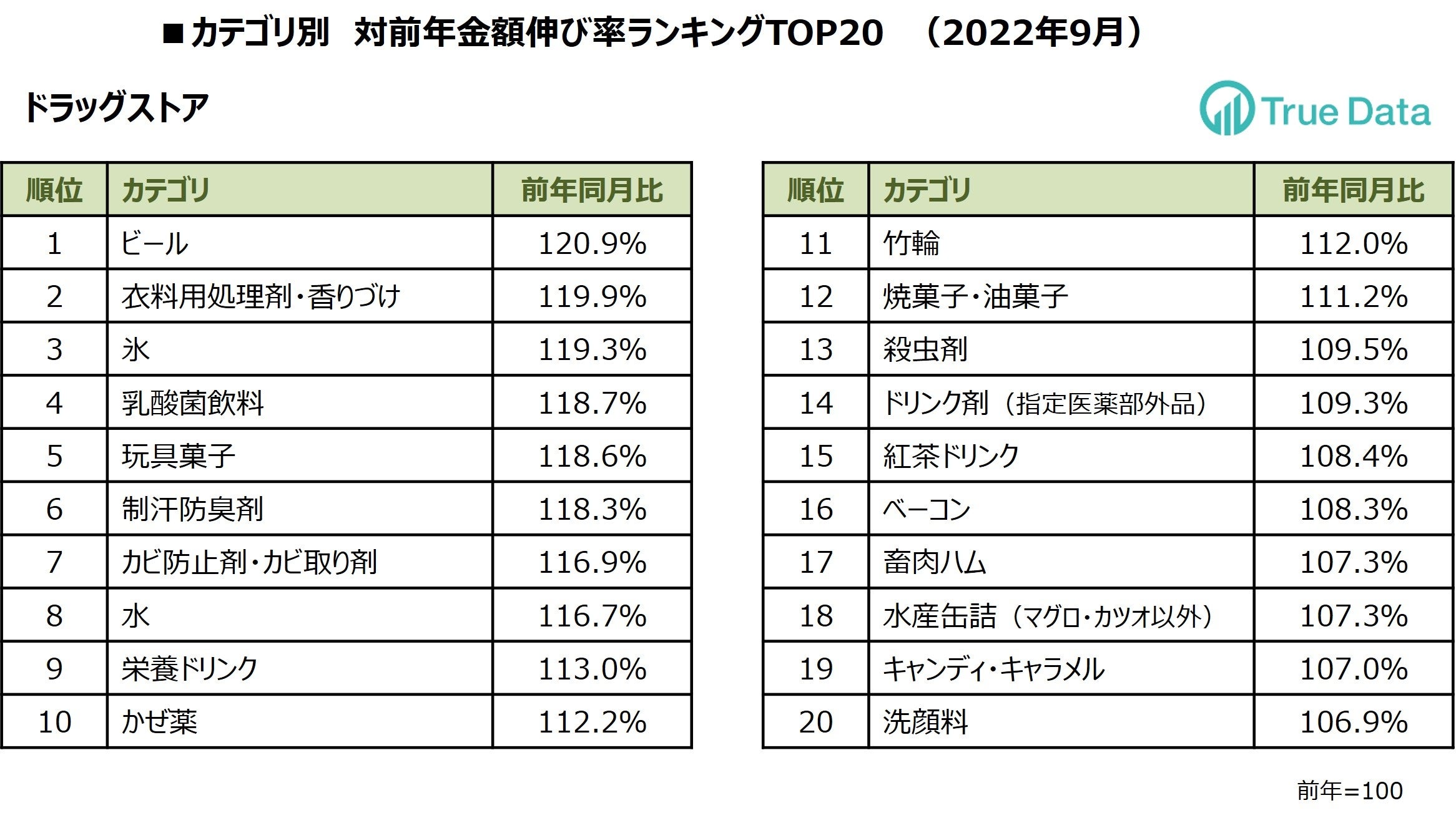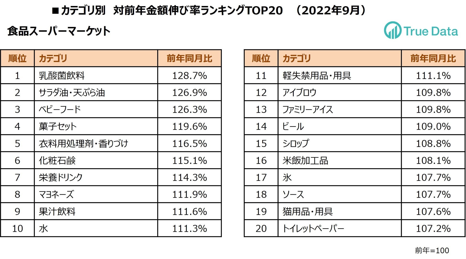 ~ドラッグストア、食品スーパーマーケット 2022年9月の対前年伸び率TOP20カテゴリを発表 ~