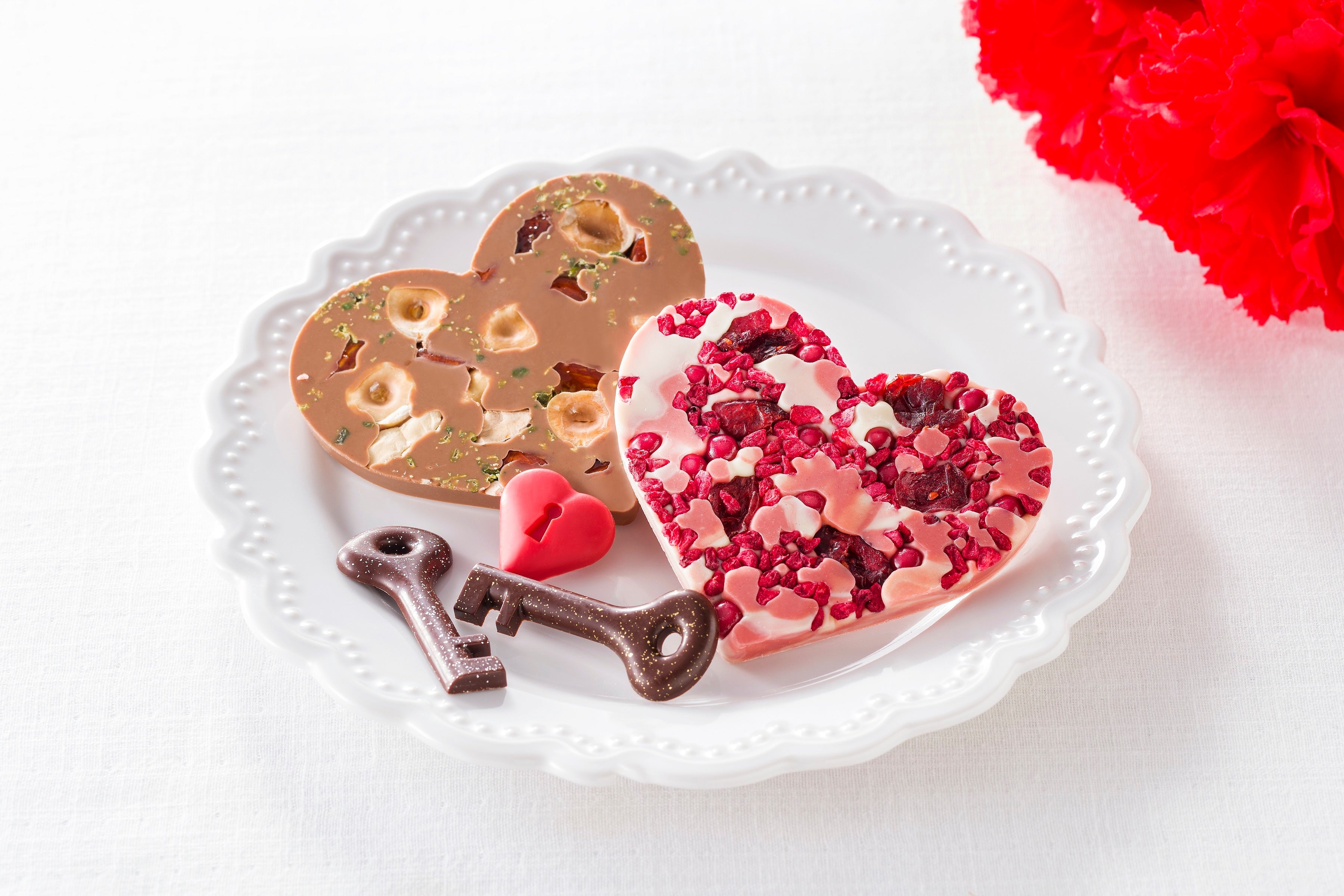 ドライクランベリーにサクサクの食感も楽しめるフランボワーズのパールショコラとドライフランボワーズを贅沢に加えたブラン(ホワイト)とフレーズ(いちご)のマーブルショコラ、ジャンドゥジャのショコラにヘーゼルナッツ、ピスタチオとショコラティエが丁寧にキャラメリゼしたアーモンドを加えた「ブランフレーズ」、「ジャンドゥジャ」の2種類のマンディアン。鍵型や鍵穴のハート型タブレットショコラも入った母の日に最適のギフトです。