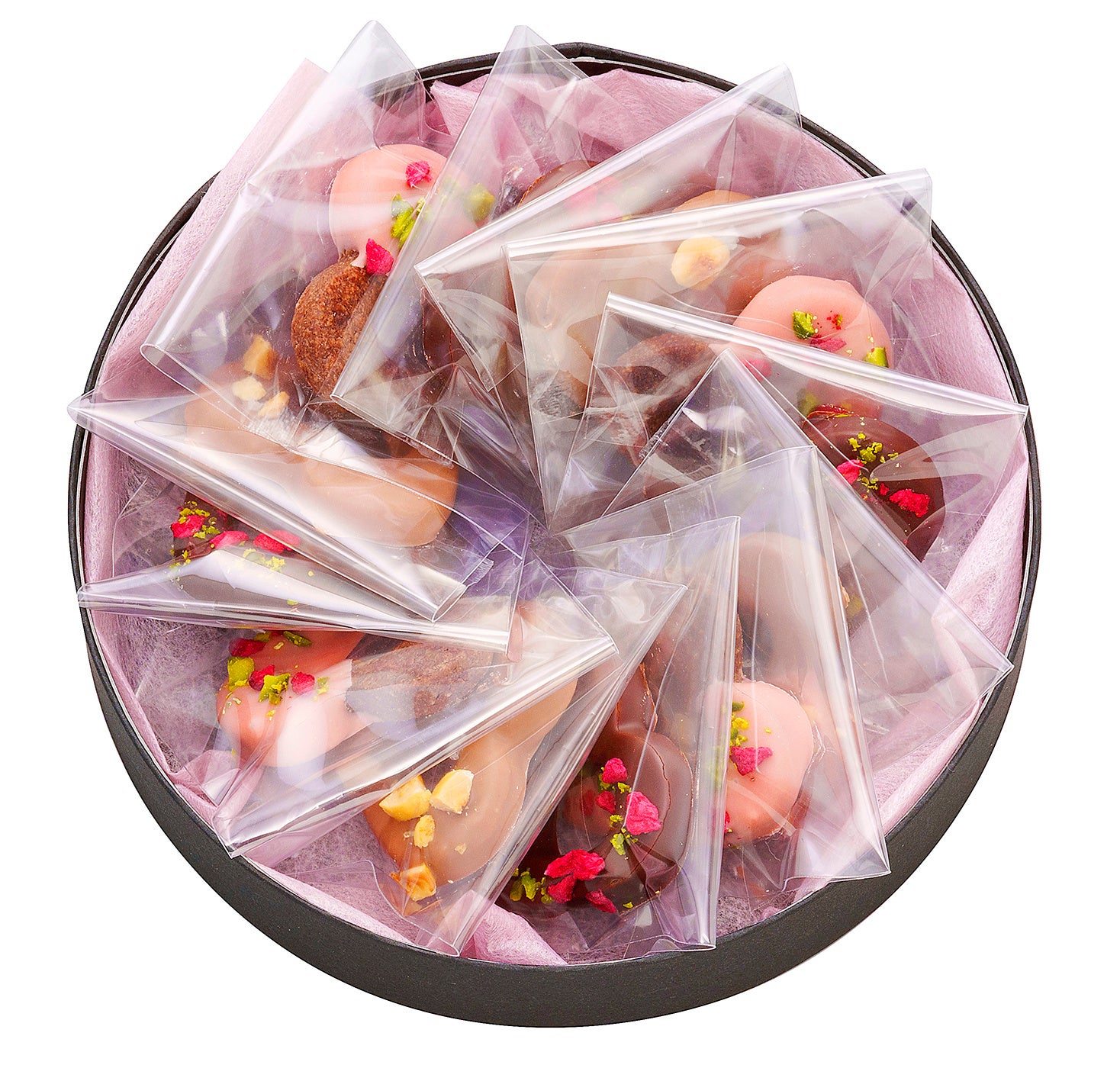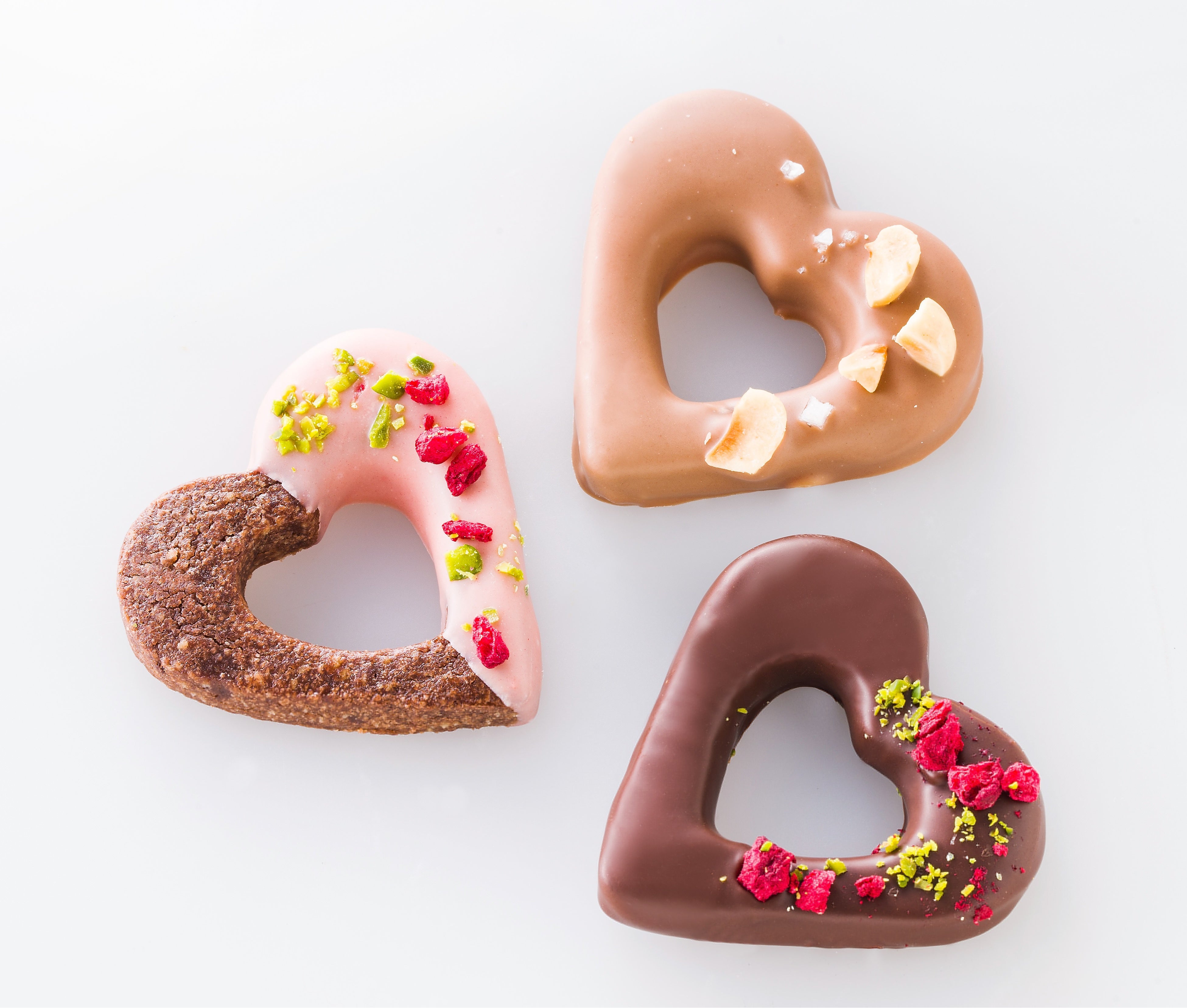 ハート型が可愛いサクサク食感のココアサブレに、フレーズ、オレ、ノワールの3種のショコラをコーティングした彩り豊かなサブレセット。フレーズ、ノワールには、フランボワーズとピスタチオを。オレには、ヘーゼルナッツとフルールドセルを散りばめました。