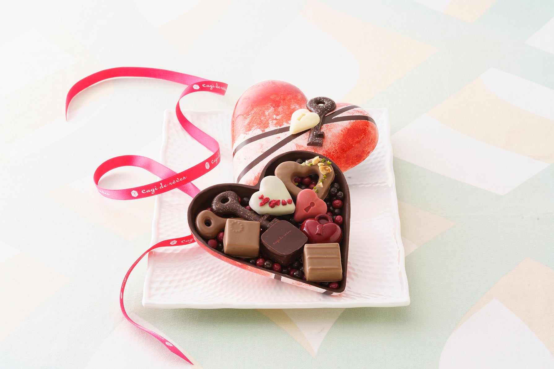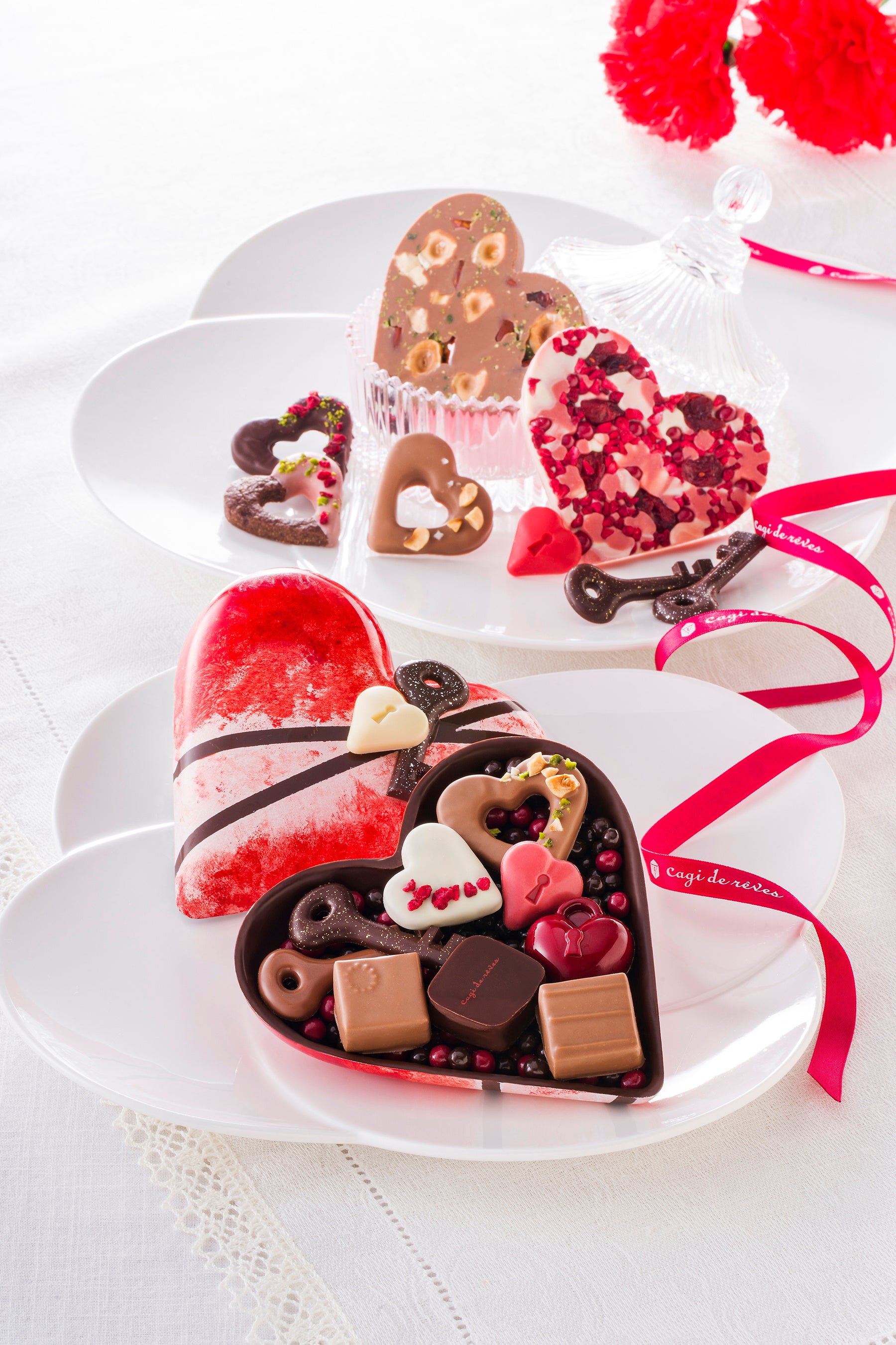 母の日を象徴するカーネーションをイメージした大きなハートの器を開けると、宝石のような華やかな色合いのショコラが感謝の気持ちを彩ります。