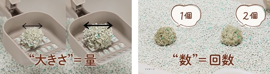 目盛り付きのスコップだから、排泄物が固まってできる「猫砂ボール」※7の大きさでオシッコの量が一目でわかります。また「猫砂ボール」(※7)の個数でオシッコの回数がわかります。観察を毎日の習慣とすることで、こまめに猫の健康チェックができます。