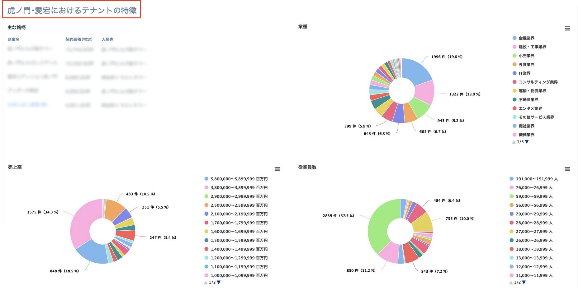 周辺動向を調査する際、指定したエリアに入居するテナント企業の業種や売上高などを簡単に確認することが可能になりました。リーシング時のテナント誘致に役立てていただけます。