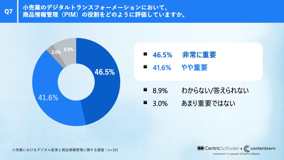 一方で、約7割の企業が商品情報管理に前向きな投資意向を示すなど、情報基盤の整備に向けた関心が高まりつつあることが明らかになりました。
