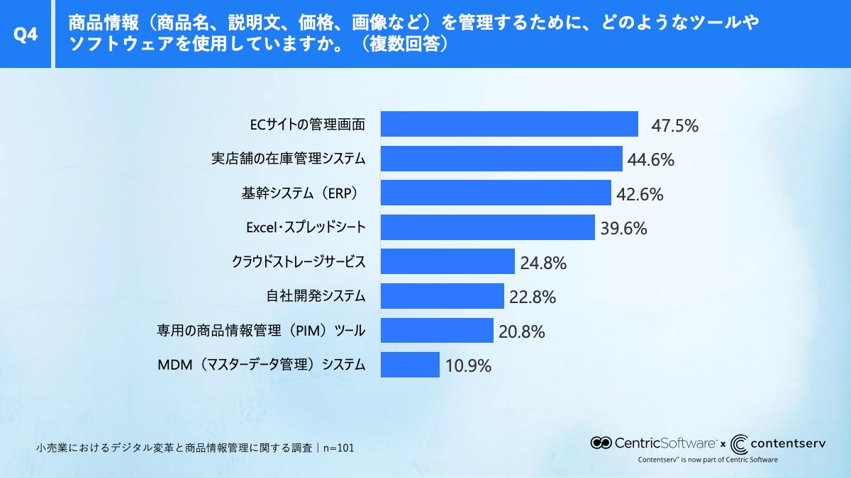 商品情報は「ECサイト管理画面」47.5%、「在庫管理システム」44.6%、「Excel・スプレッドシート」39.6%など、複数のツールに分散して管理されており、一元的な情報基盤は整っていないのが実情です。専用の商品情報管理(PIM)ツールを活用している企業はわずか20.8%にとどまります。