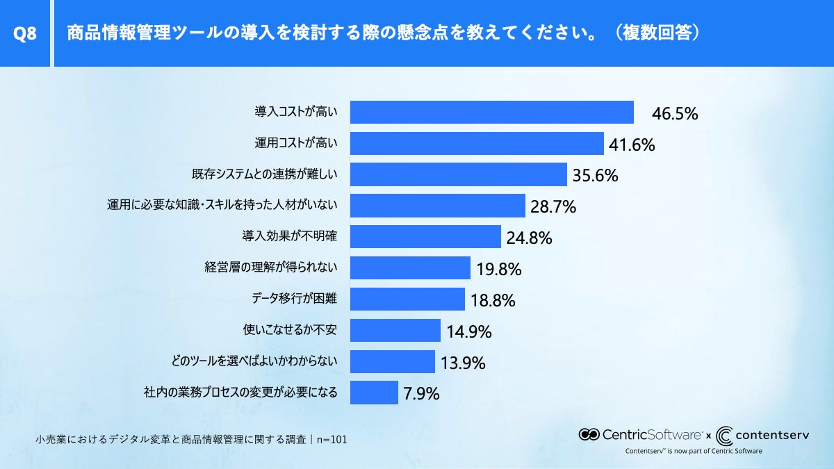 一方で、「導入コストの高さ」(46.7%)、「運用コスト」(41.6%)、「既存システムとの連携の難しさ」(35.6%)などが、導入の主な障壁として挙げられています。