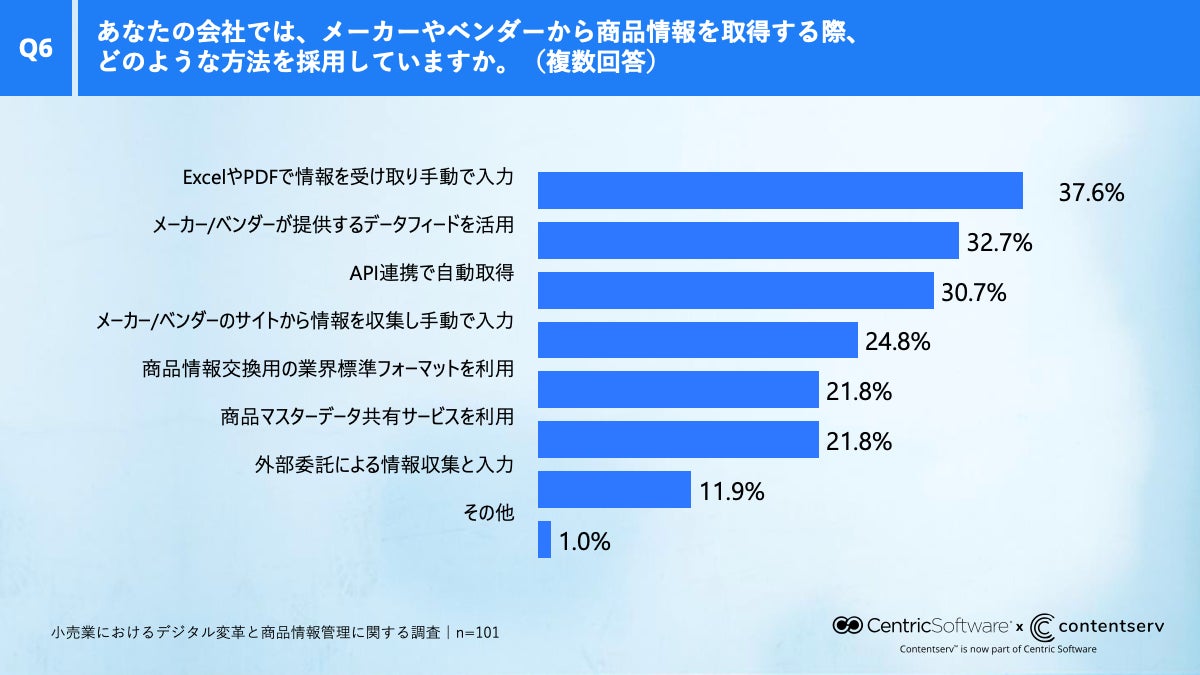 商品情報の取得では、「Excel・PDFで受領し手動入力」が最多(37.6%)となっており、サプライヤーとの情報連携における手間や属人性が情報整備のボトルネックとなっていることが分かりました。