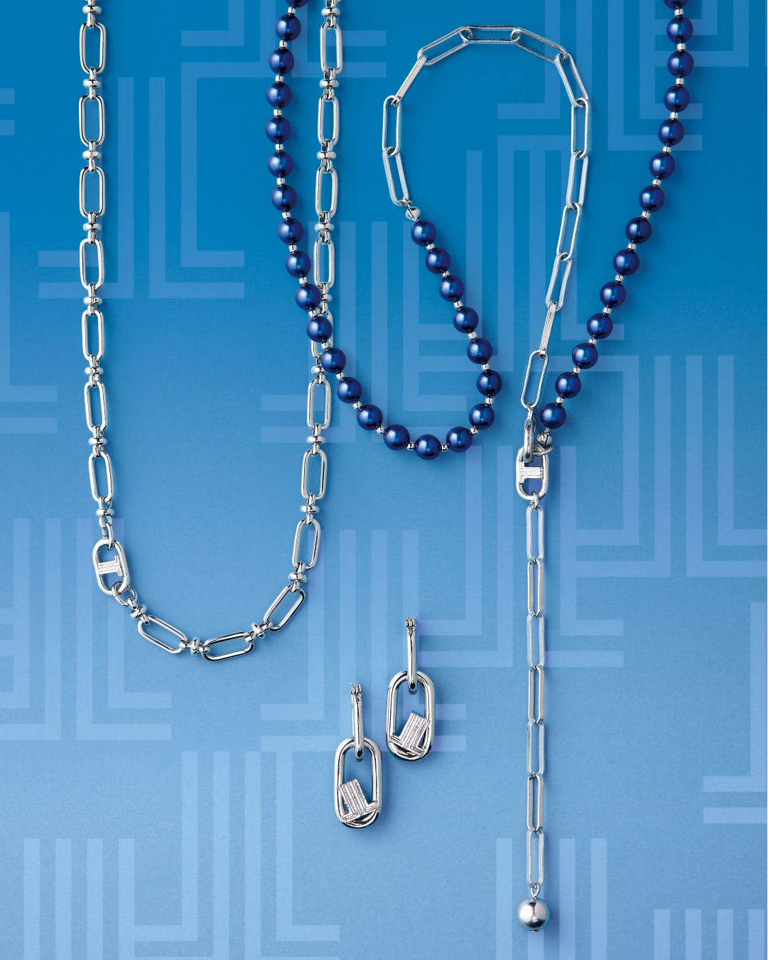 オリジナルのダブルJLロゴとチェーンを組み合わせたモダンなネックレス、目を引くブルーのパールとチェーンをミックスしたY字ネックレス、ダブルJLロゴを際立たせた縦長フォルムのピアス(イヤリング)など、着ける人を選ばないニュートラルなデザインが揃います。ペアで揃えたり、シェアしたり、多様なニーズに対応できるラインナップです。