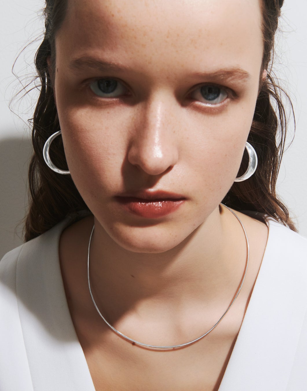 丸みを帯びたフォルムに、シルバーの艶やかな光沢が映えるボリュームフープピアス。