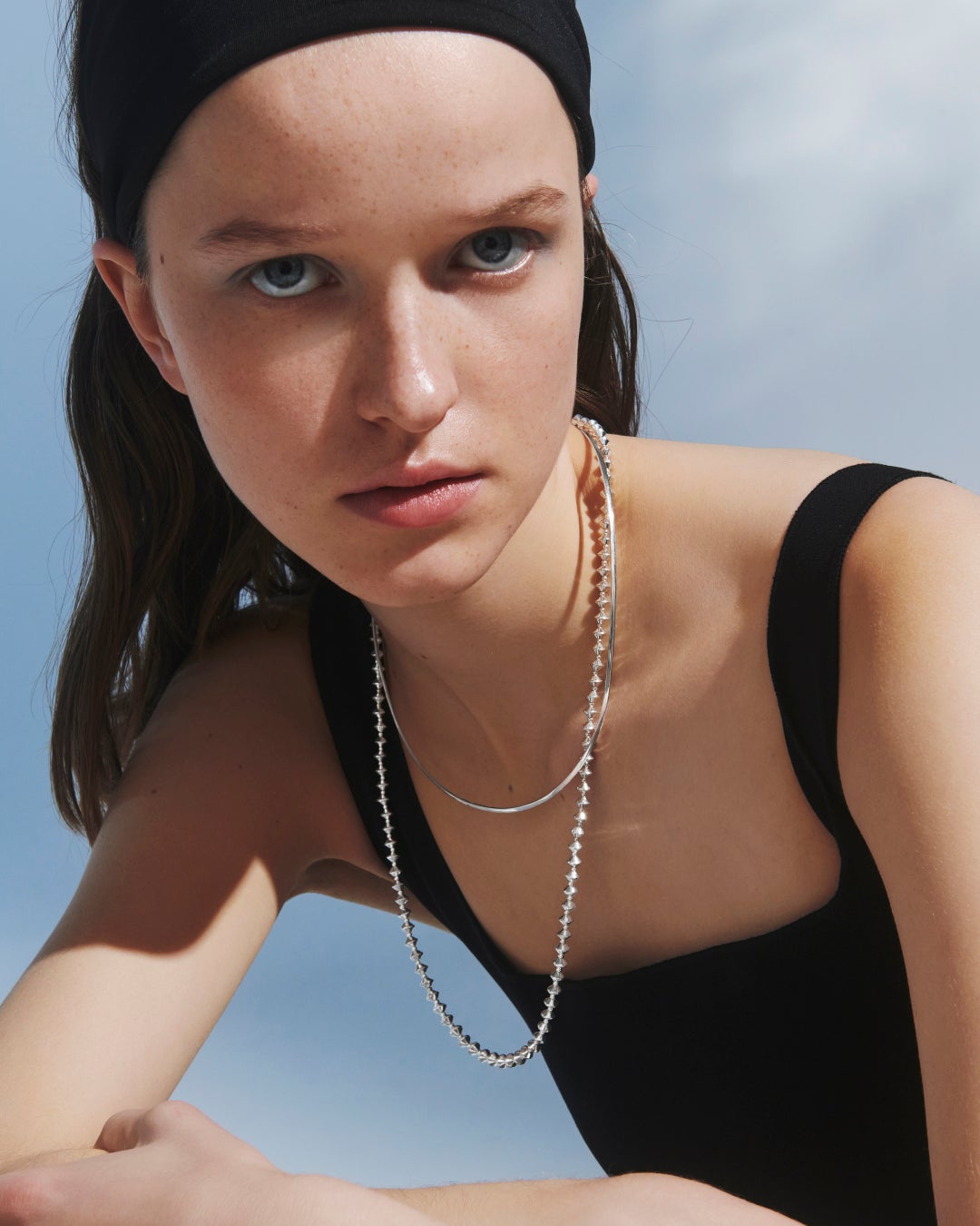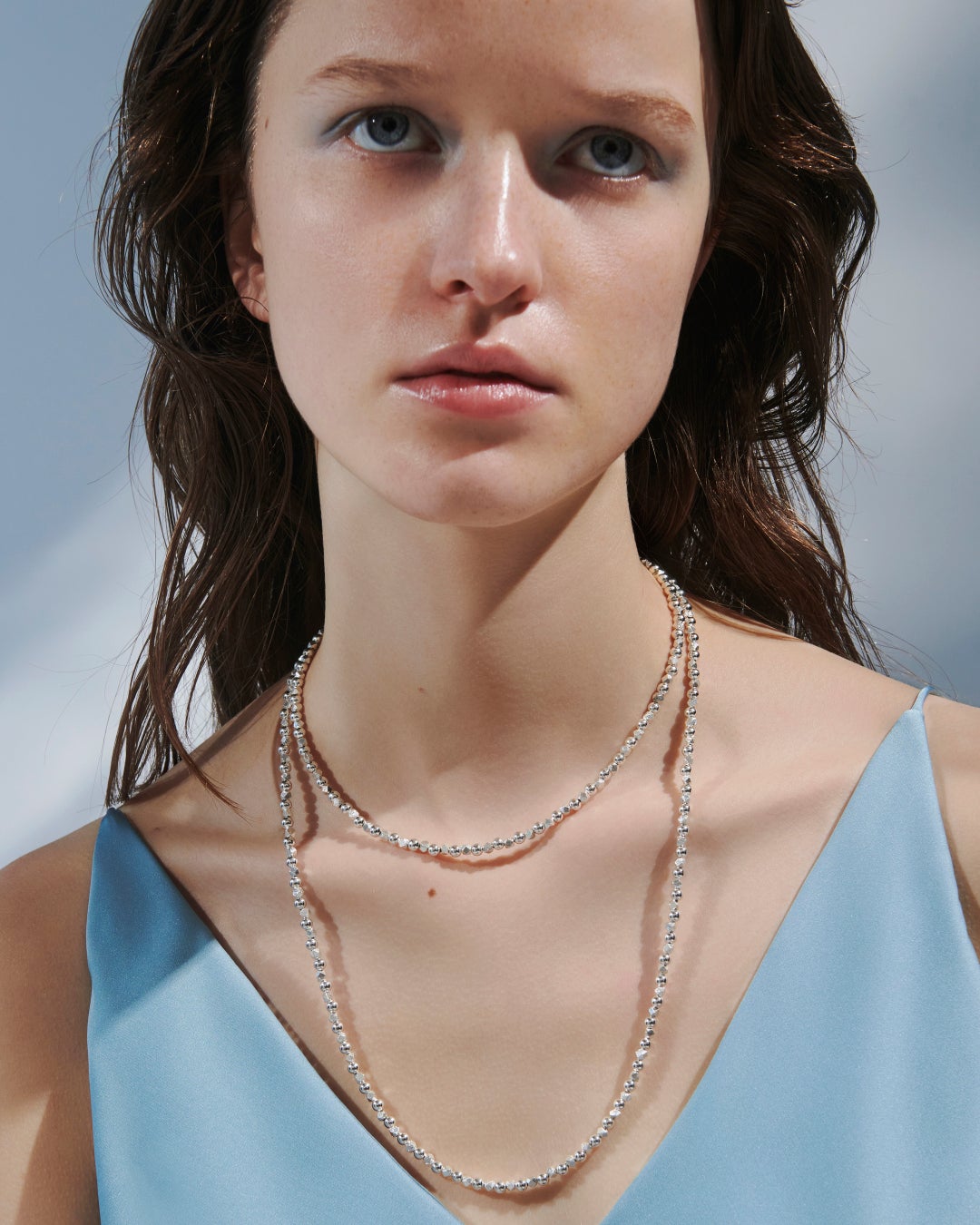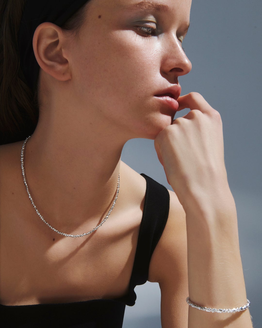 素肌が見えるキャミソールやトップスに合わせると、シルバーの透明感が際立ち、デコルテに艶やかな輝きを添えてくれます。