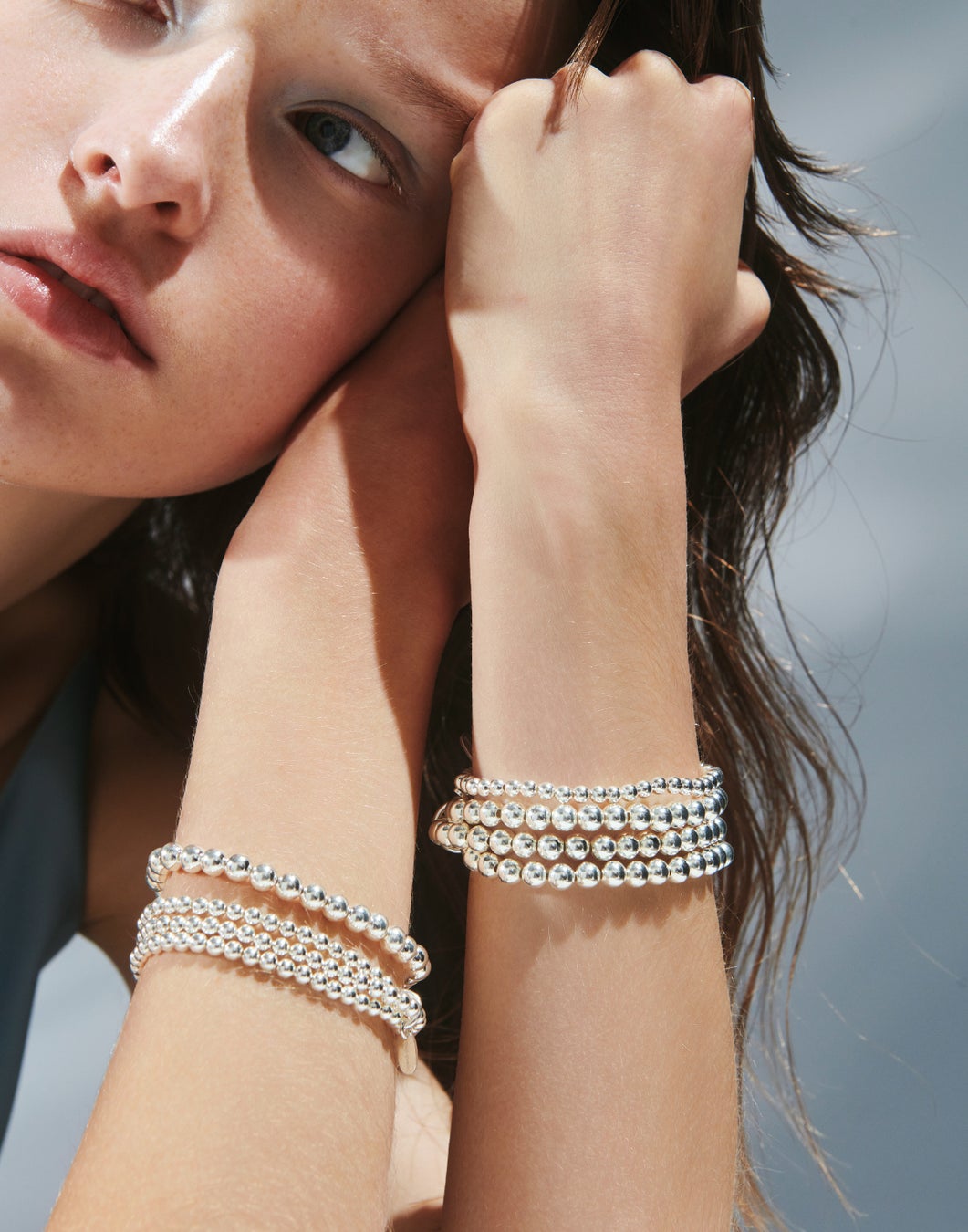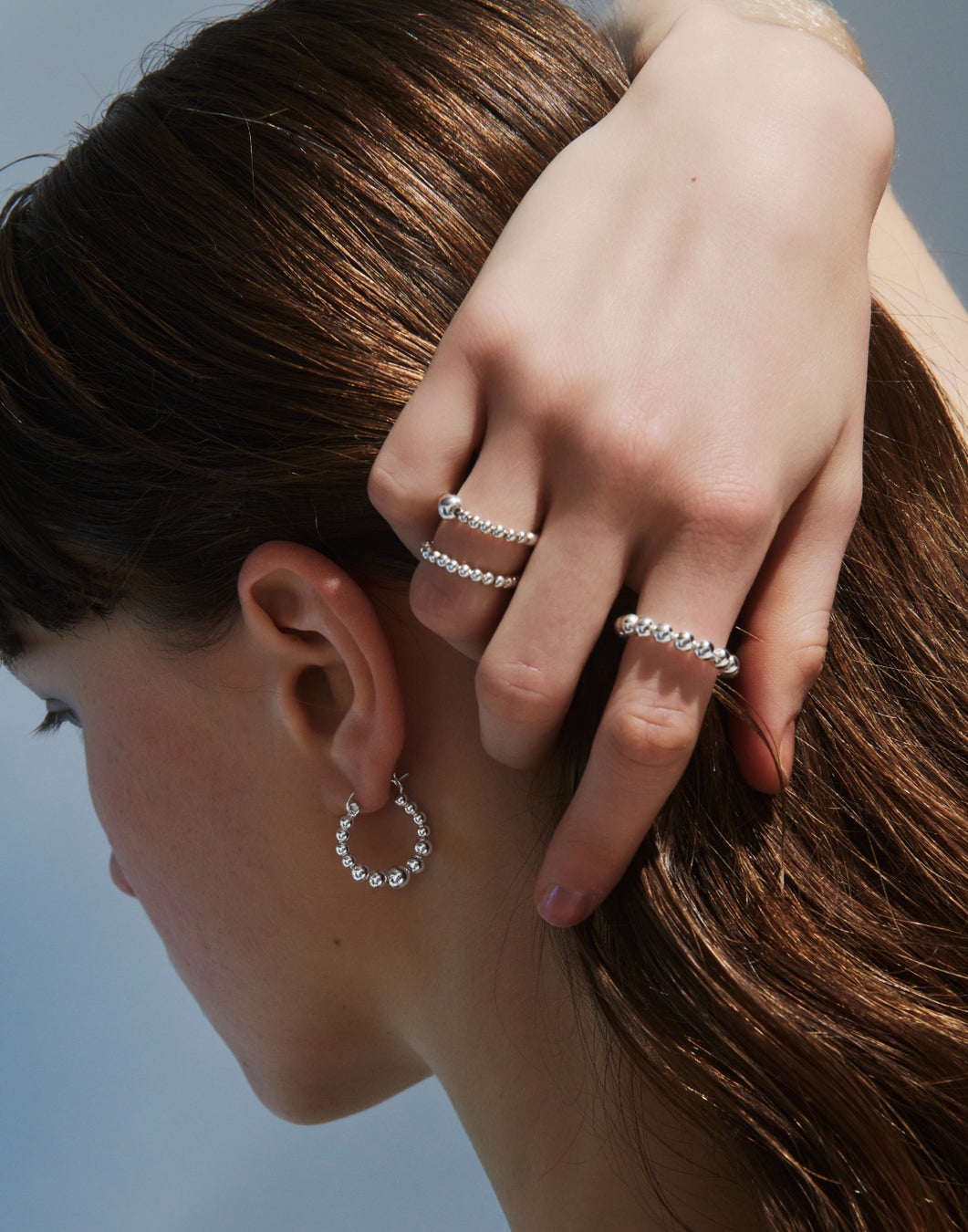 シルバーボールをリズムよく連ねた、モダンな佇まいのブレスレットとリングが登場。