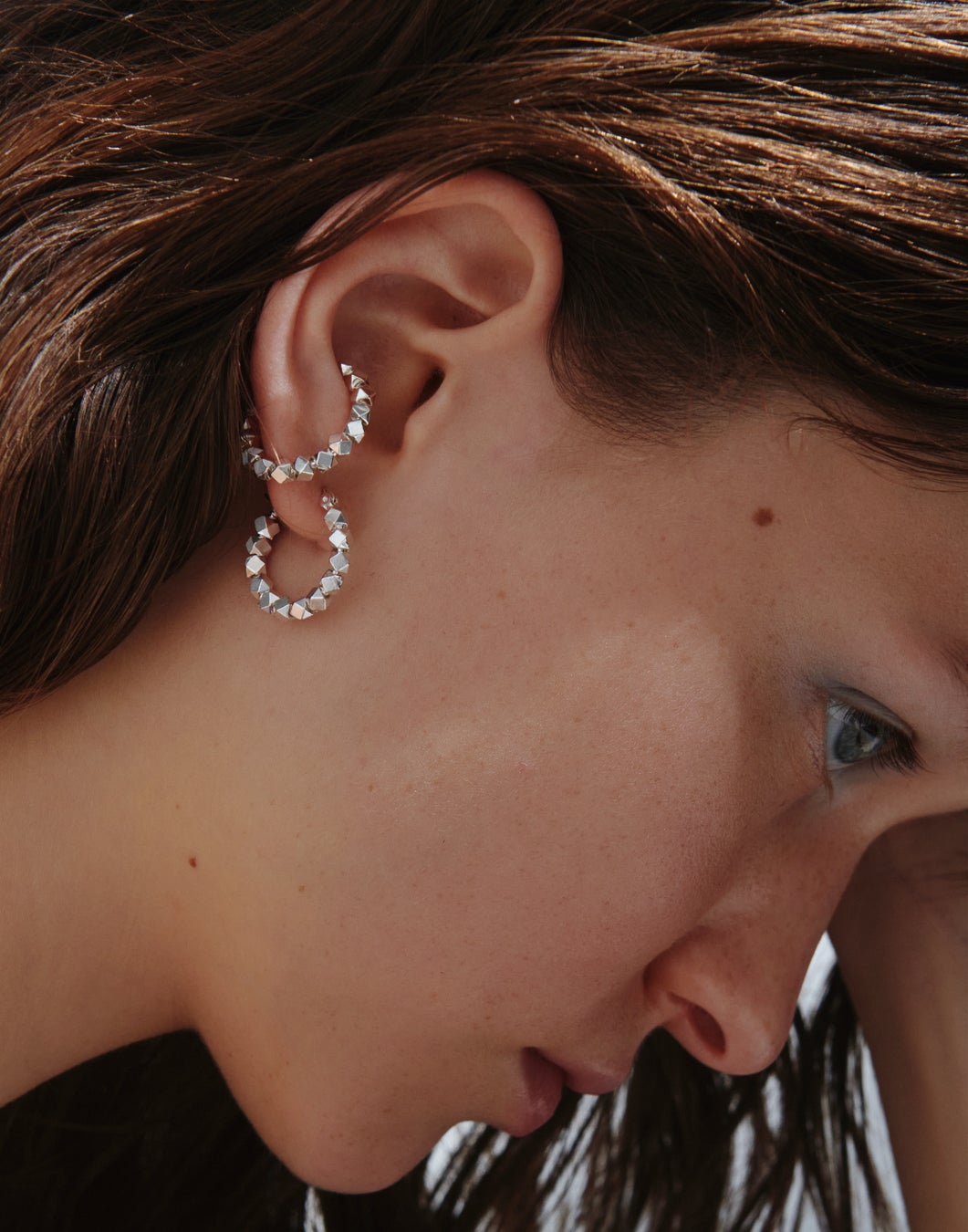 艶やかなシルバーの光沢が目を惹く、シャープで洗練されたquip queintのピアスに注目して。