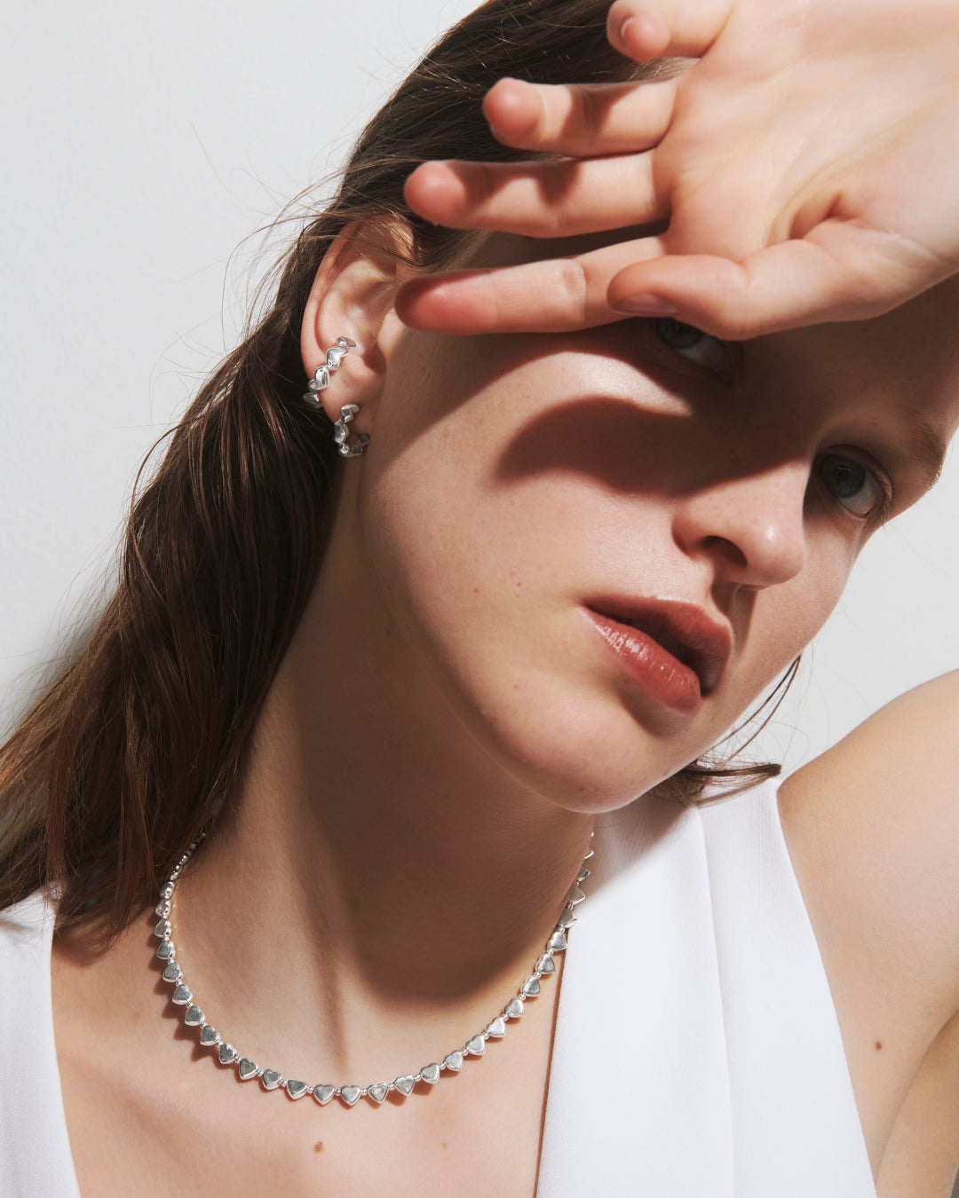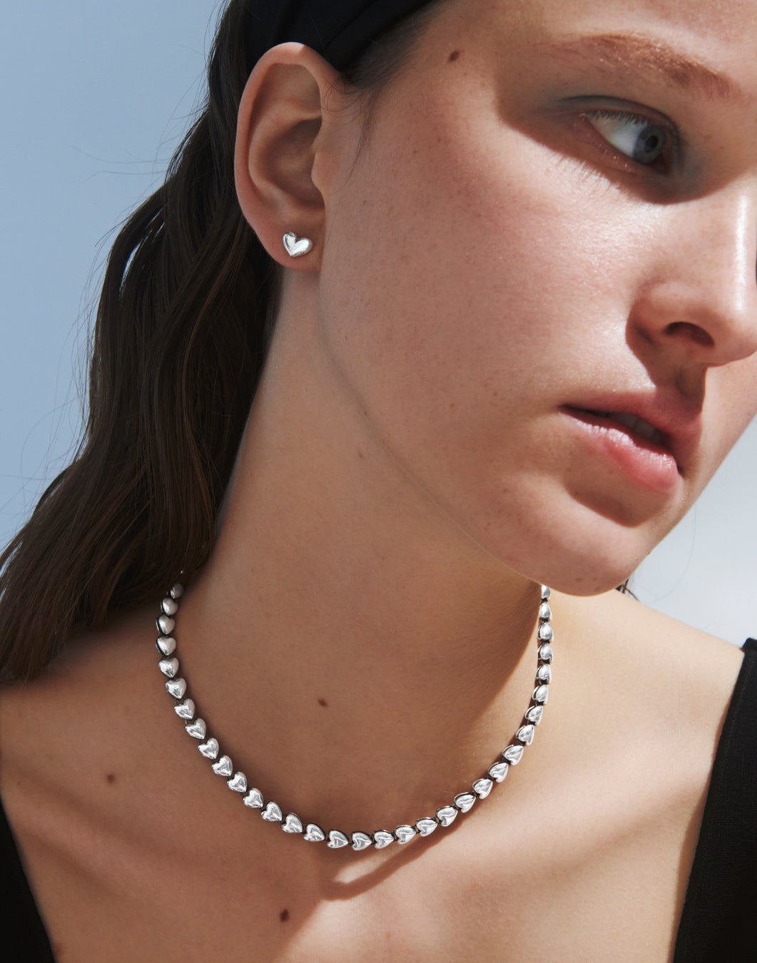 立体的なハートと、きらりと輝くシルバーボールをリズムよく連ねた、視線を奪うチャーミングなネックレス。
