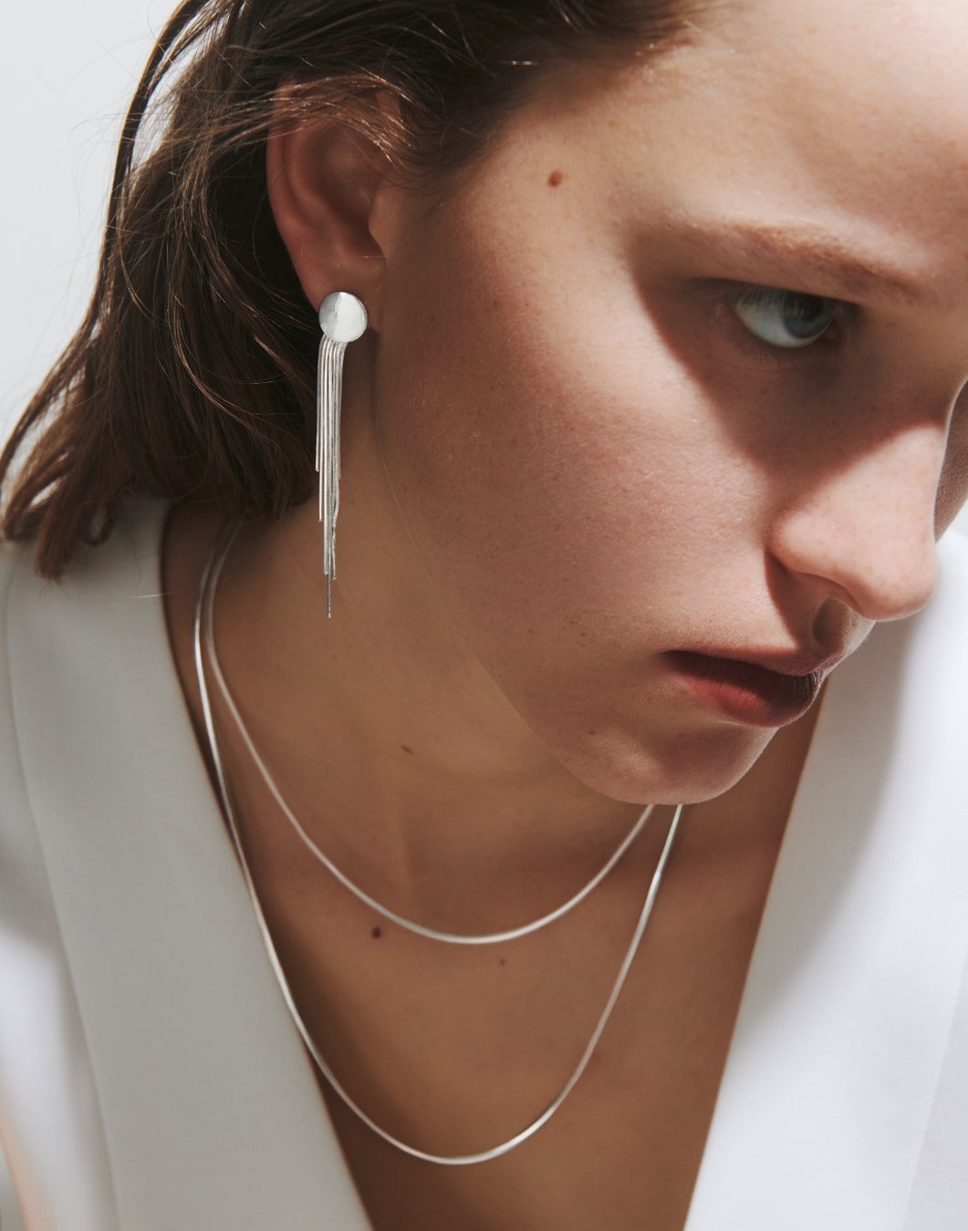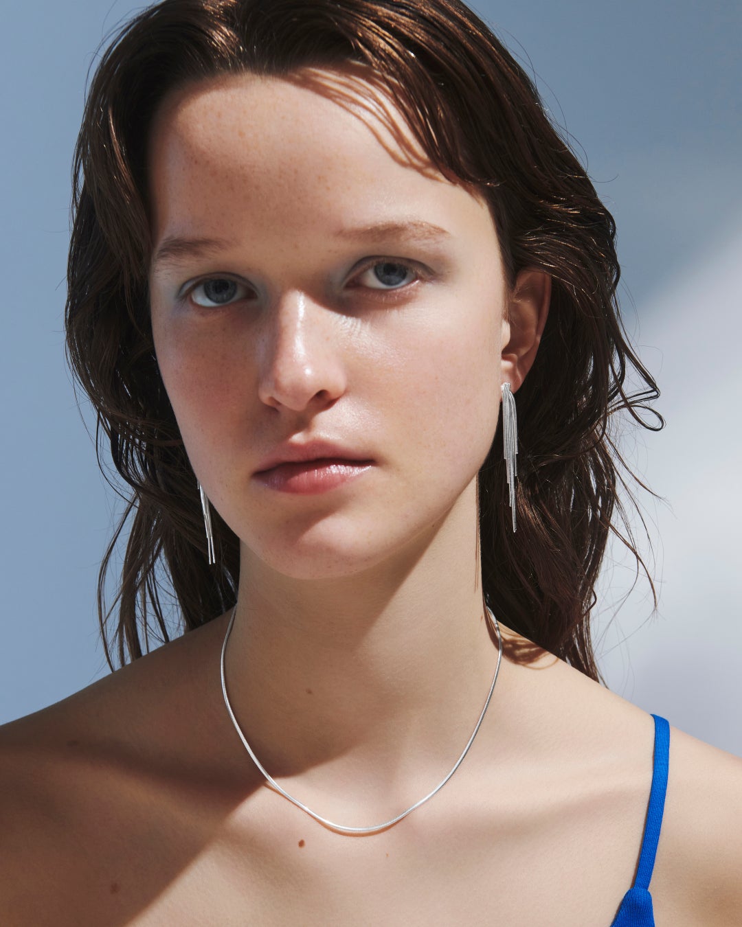クリーンなシャツやミニマルなワンピースと合わせて、ピアスの動きと輝きを主役に。