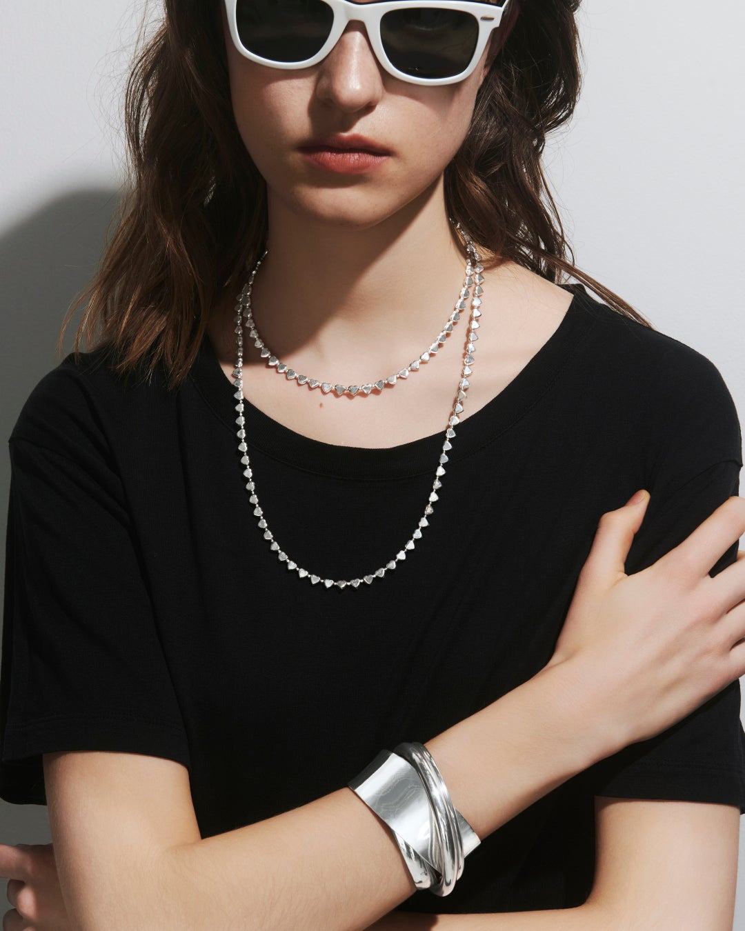 軽くプレスされたようなシルエットのハートを連ねた、モード佇まいのネックレス。