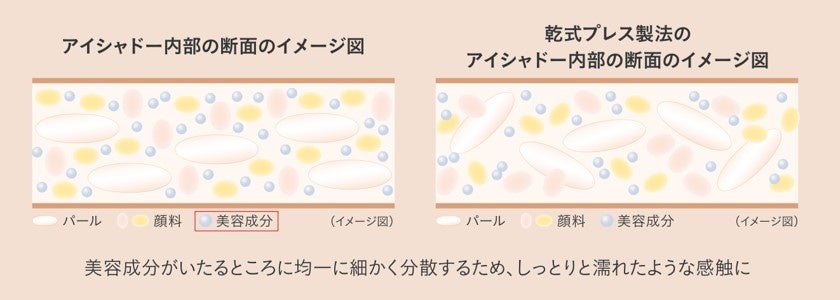 敏感な目元悩みへのスキンケア効果を強化させるため、美容オイルで固めた湿式プレス製法でよりしっとりしたパウダーのテクスチャーを実現。美容オイルをしっかり閉じ込め、更になめらかに伸びる質感に進化し、時間が経ってもかさつきにくく、粉っぽくならない処方で仕上げています。