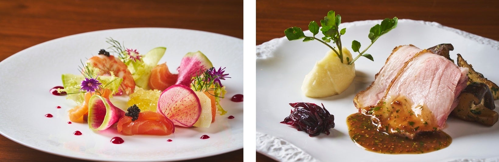 タンカンの爽やかな香りをまとったサーモンマリネ、艶やかな車海老、大地の恵みを感じる根菜が織りなす色彩豊かな前菜に、メインには甘く香るスパイスをまとわせ、じっくりと火を入れたあぐー豚のローストに、ローゼルの可憐な酸味を添えて。食後の余韻は、濃厚なチョコレートと甘酸っぱいラズベリーが織りなす至福のデザートが演出します。この特別な季節にしか味わえない、珠玉の美味を心ゆくまでお楽しみください。
