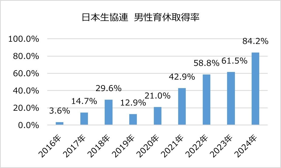 育休取得率が伸長した背景として、2022年10月1日に改正された「育児・介護休業法」により創設された「産後パパ育休(出生時育児休業)」制度※などが挙げられますが、日本生協連独自の取り組みでも職員の働き方をサポートしています。 ※ご参考:厚生労働省 育児休業制度 特設サイト(https://www.mhlw.go.jp/seisakunitsuite/bunya/koyou_roudou/koyoukintou/ryouritsu/ikuji/point.html)