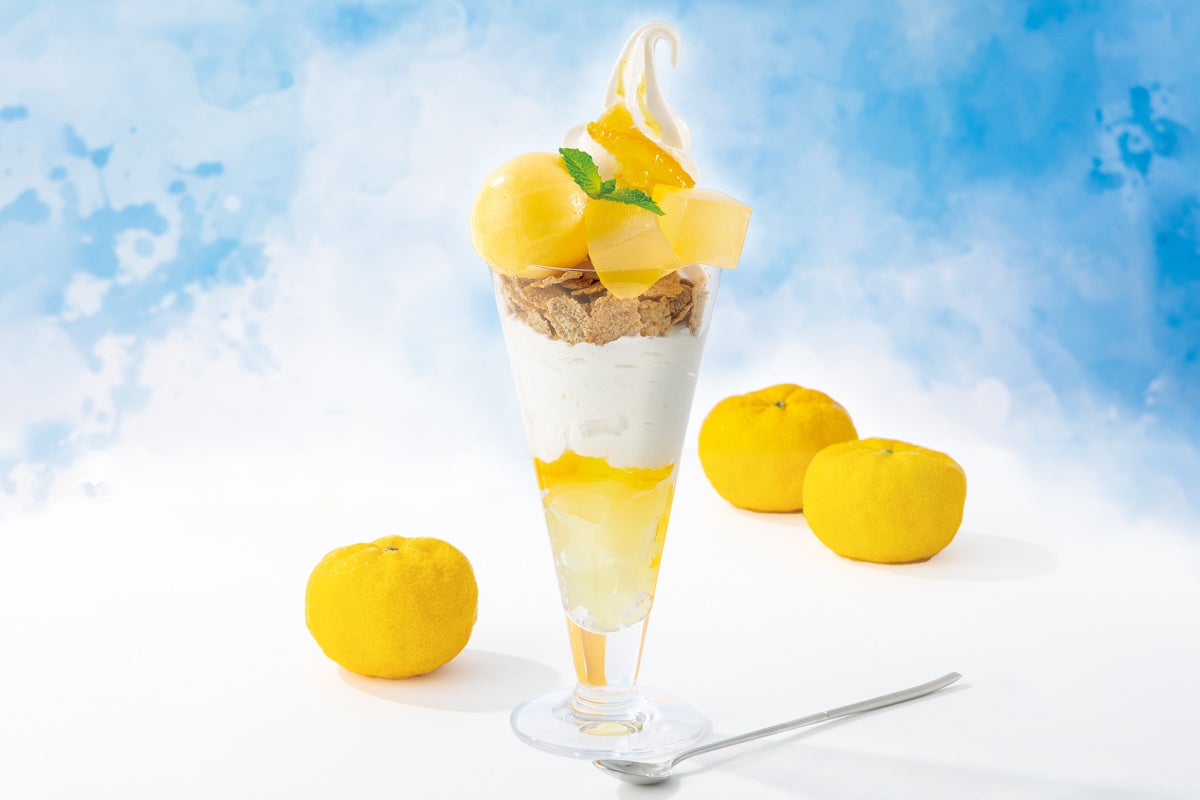 国産柚子の爽やかな酸味と、もちもちわらび餅の甘さで夏を楽しむ、きらめきゆらぐ夏パフェです。