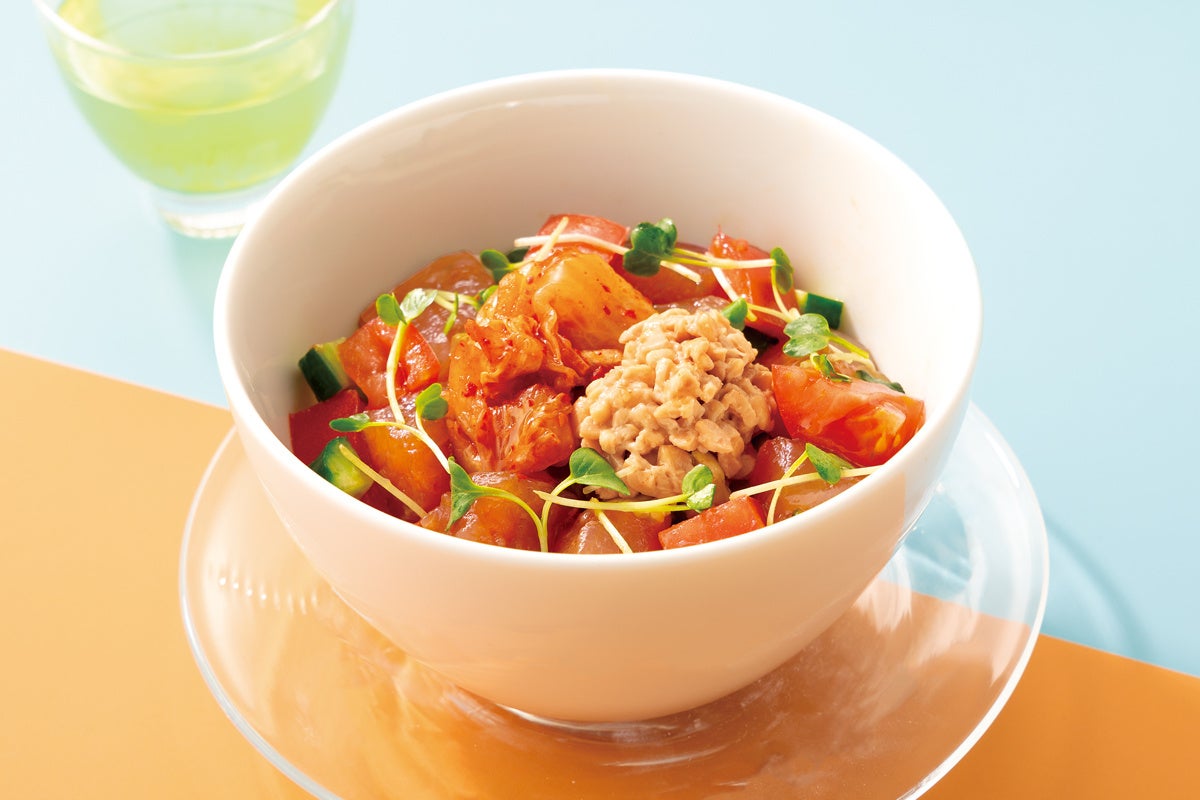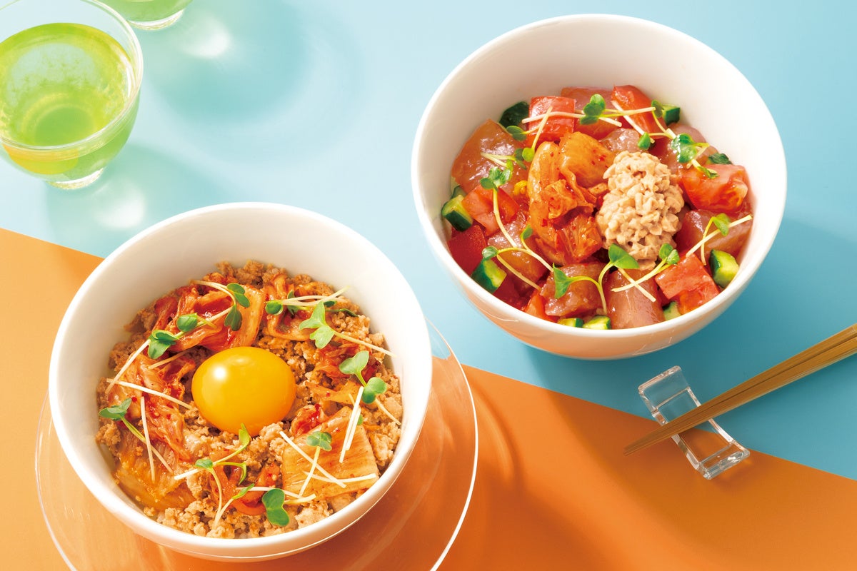 甘辛く煮込んだ鶏そぼろとキムチを組み合わせた、夏におすすめのピリ辛どんぶり。