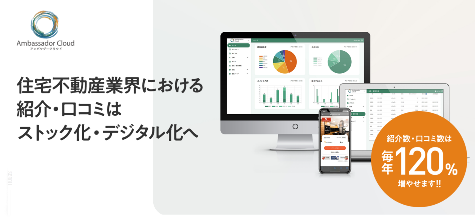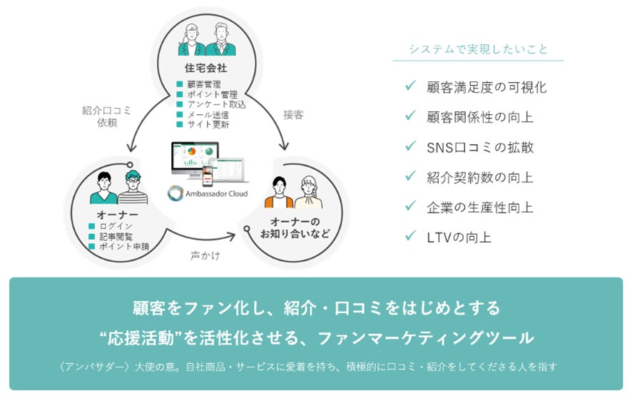アンバサダークラウドは顧客をファン化し、紹介・ 口コミをはじめとする応援活動を活性化させるためにご利用いただくクラウドサービス(https://www.ambassador-cloud.biz/)です。