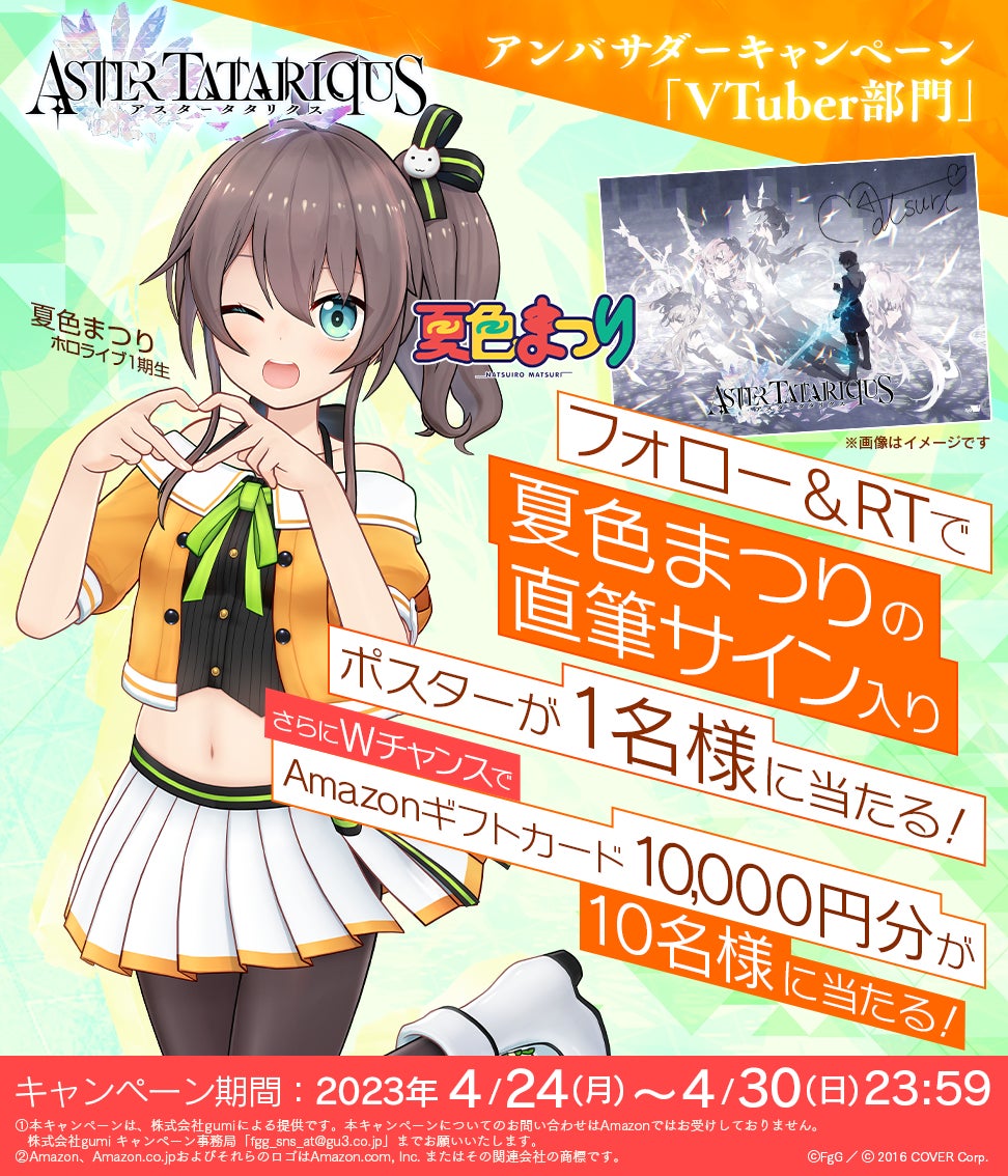 2023年4月21日(金)放送の生放送番組「『アスタータタリクス』公式生放送〜オープンキャンパス〜」において、ホロライブ所属VTuber「夏色まつり」さんの出演を記念してフォロー&RTキャンペーンも実施しております。