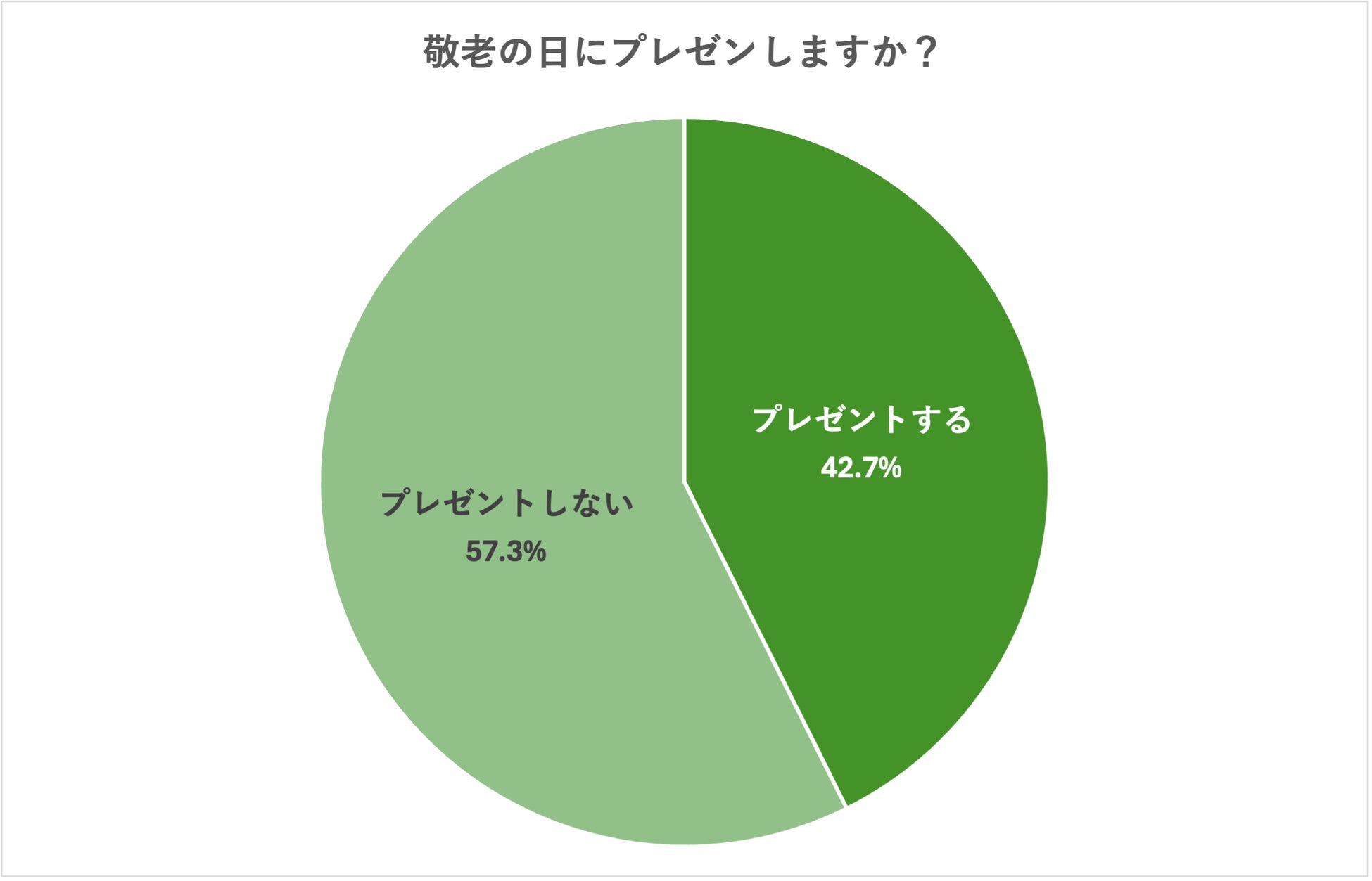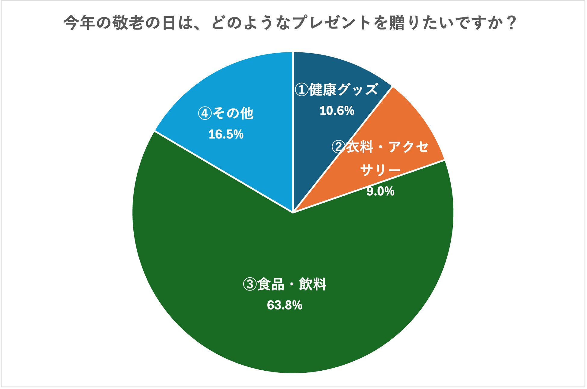 「Q. 今年の敬老の日は、どのようなプレゼントを贈りたいですか? また、敬老の日にあげて良かったものを教えてください。」とお聞きしたところ、「プレゼントしない・する人はいない」以外を回答された「プレゼントする」予定の方は全体で約4割となりました。