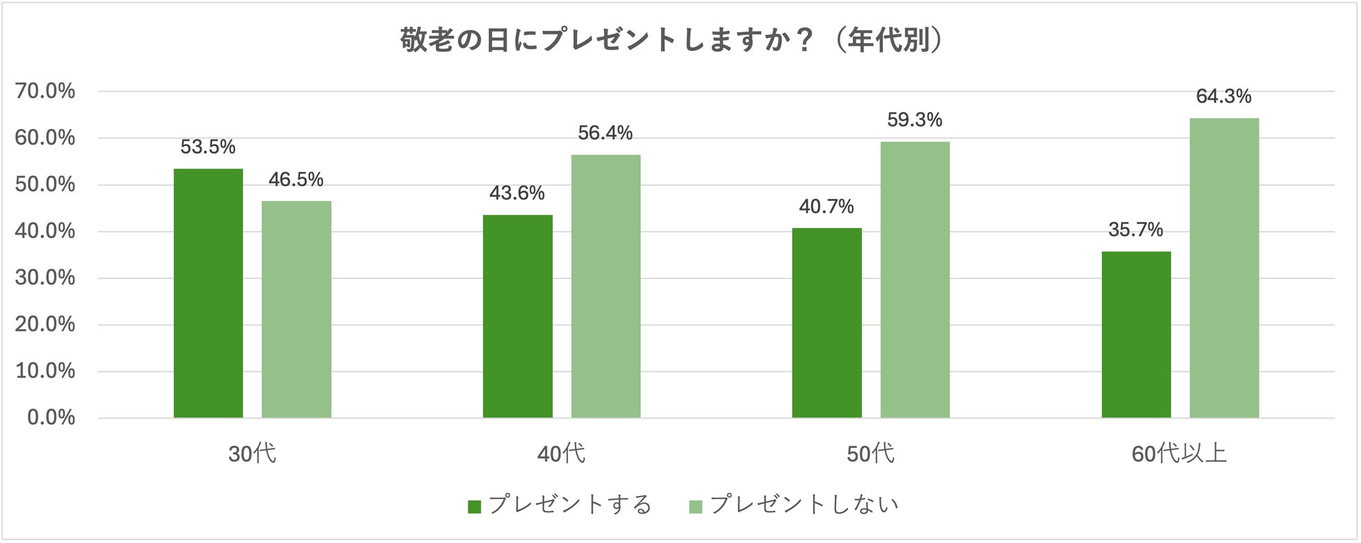 ◆敬老の日にプレゼントする方は全体の約4割、年代別では年齢が上がるにつれて「プレゼントしない・する人はいない」と回答する方が増える