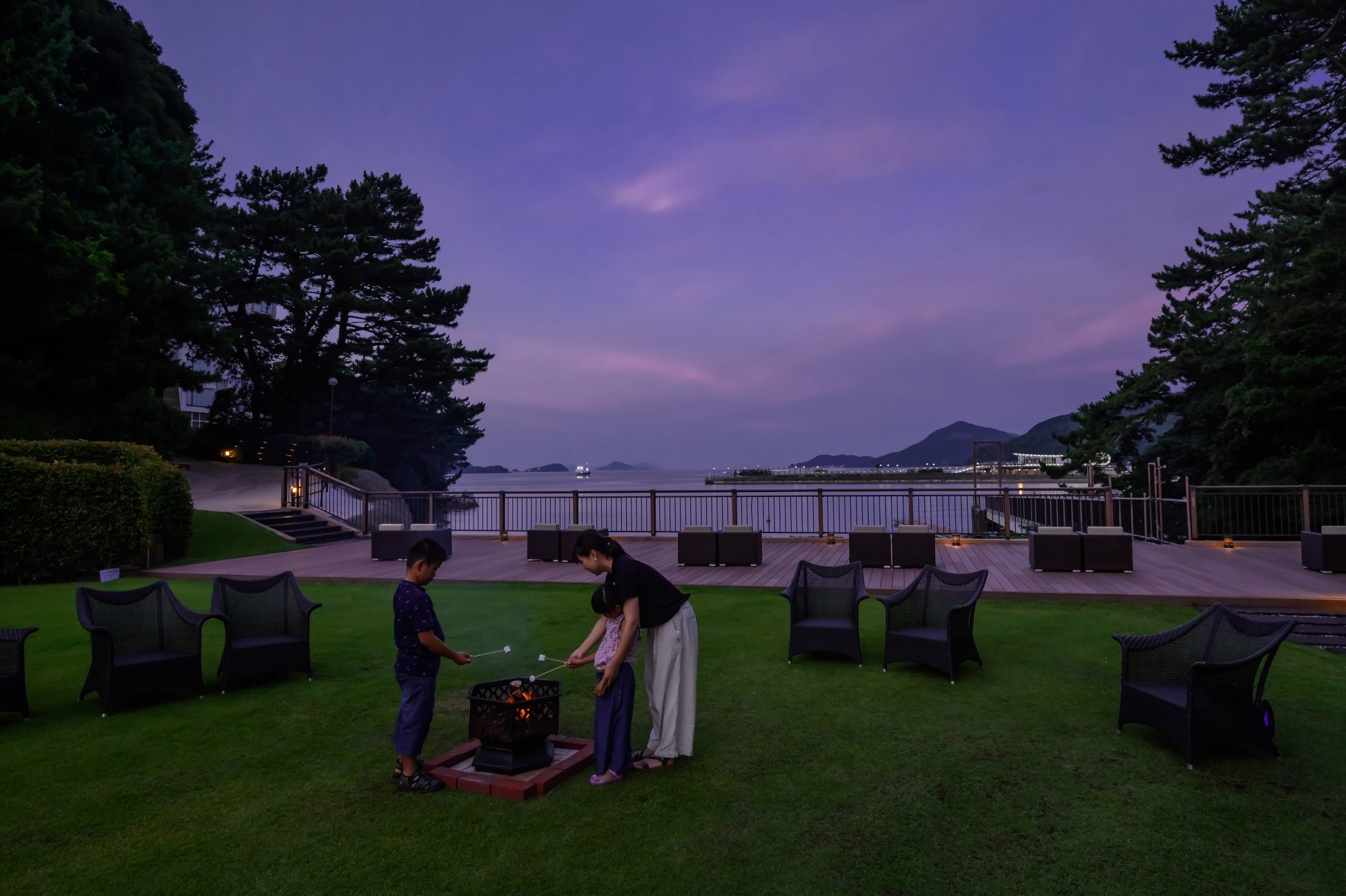 鳥羽マリンターミナルを眺める「潮香のてらす」で、初夏の風を感じながら、揺らめく炎とともに、焼きマシュマロをお愉しみいただけます。