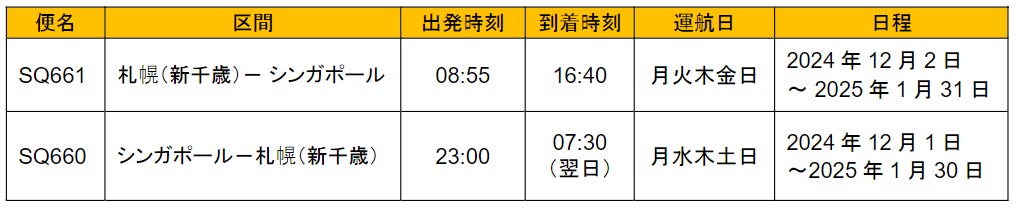 SQ661便は、関係当局の認可を前提に、札幌からシンガポールへ月、火、木、金、日に運航します。8時55分(現地時間)に札幌・新千歳空港を出発し、同日の16時40分にシンガポールに到着する予定です。