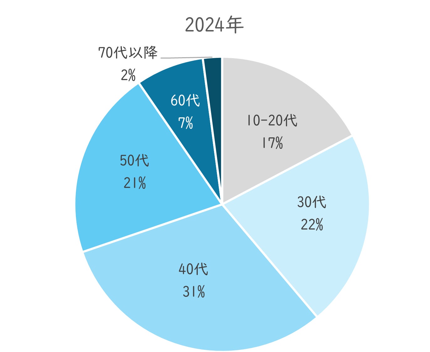 年齢別の傾向を確認すると、主要な年代は多い順に 40代(31%)、30代(22%)、50代(21%)。