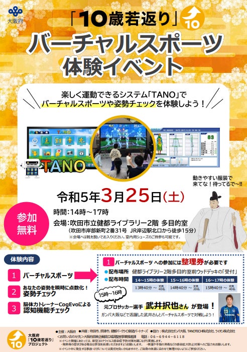 TANOTECH株式会社(神奈川県平塚市 代表取締役:三田村勉 以下「TANOTECH」)が開発・販売する「モーショントレーニングツールTANO」が、大阪府が主催する「10歳若返り」バーチャルスポーツ体験イベントに採用されました。