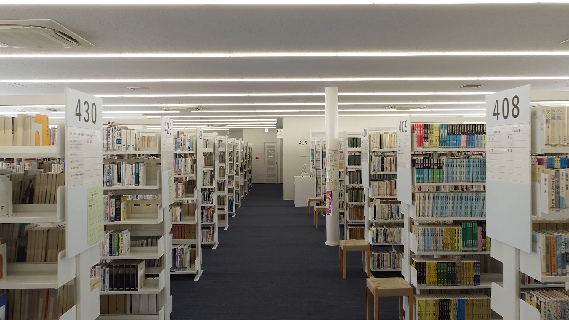 建物外観の空撮からはじまり、図書館の内部を利用者目線でドローンが飛行しながら撮影。