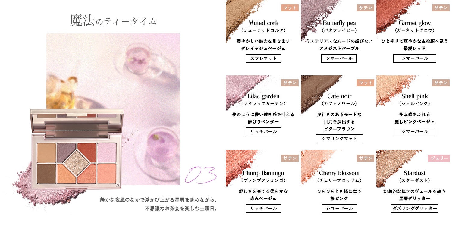 ひと塗りでまばゆい煌めきを放ち、タイムレスな魅力を宿す9色入りのアイシャドウパレットです。透明感のあるシマー、ふんわりなじむマット、贅沢に輝くグリッターなど、毎日使いたくなる多彩な色と質感の組み合わせ。まぶたの一部になりすますような肌なじみの良さで、ナチュラルメイクから洗練されたメイクまで、幅広いルックを叶えます。