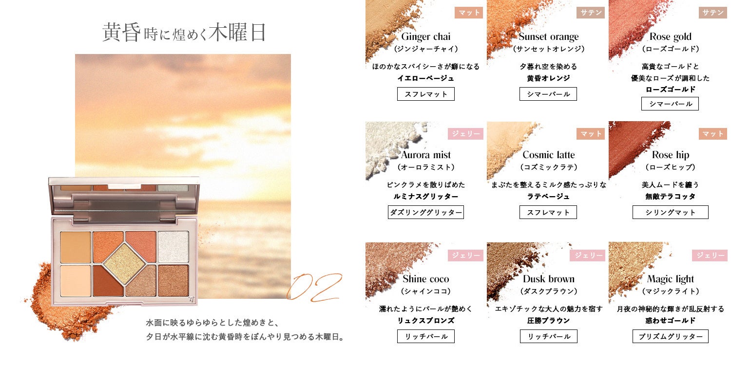 タイでは自分の生まれた曜日を大切にする文化があり、その曜日によって自分のシンボルカラーや守護仏が決まっています。そんなタイならではの文化から着想を得て、各曜日のシンボルカラーを取り入れた、タイの神秘的なワンシーンが目に浮かぶようなパレットに仕上げました。