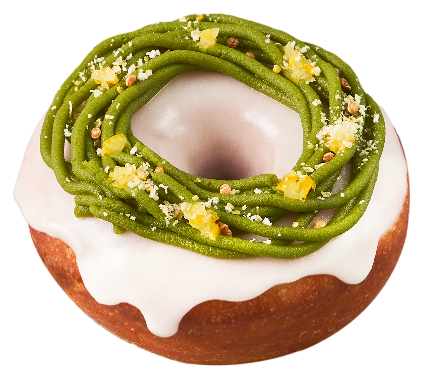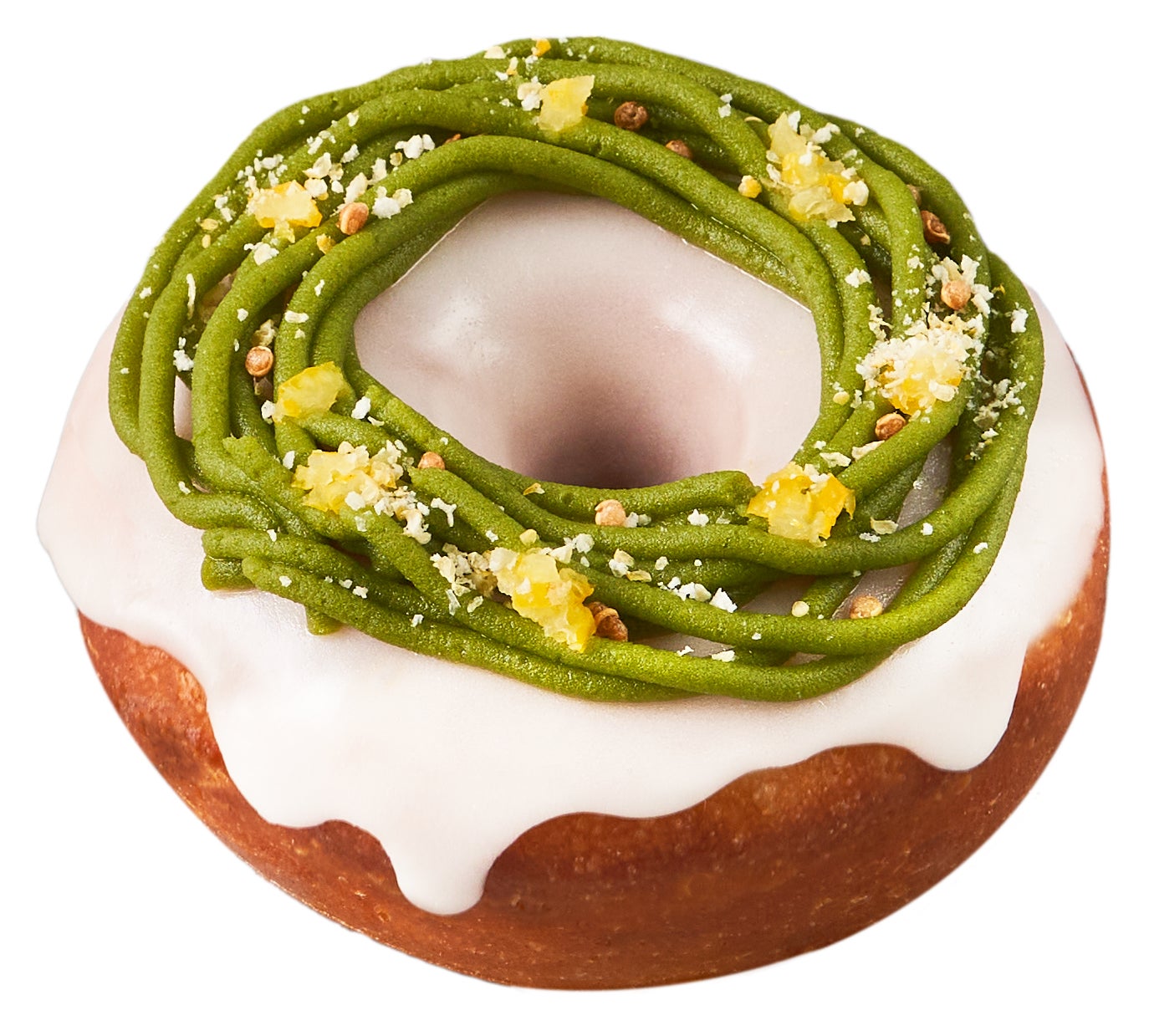 ゆずの酸味と香りに、抹茶のほろ苦さをプラスしたプラントベースのゆず抹茶ドーナツ。ゆず果汁で作ったさわやかな酸味のグレーズに、有機栽培抹茶使用の抹茶あんを絞り、アクセントとしてゆずの皮とクリスピーキヌアをトッピングしました。季節限定、新感覚の和風ドーナツです。