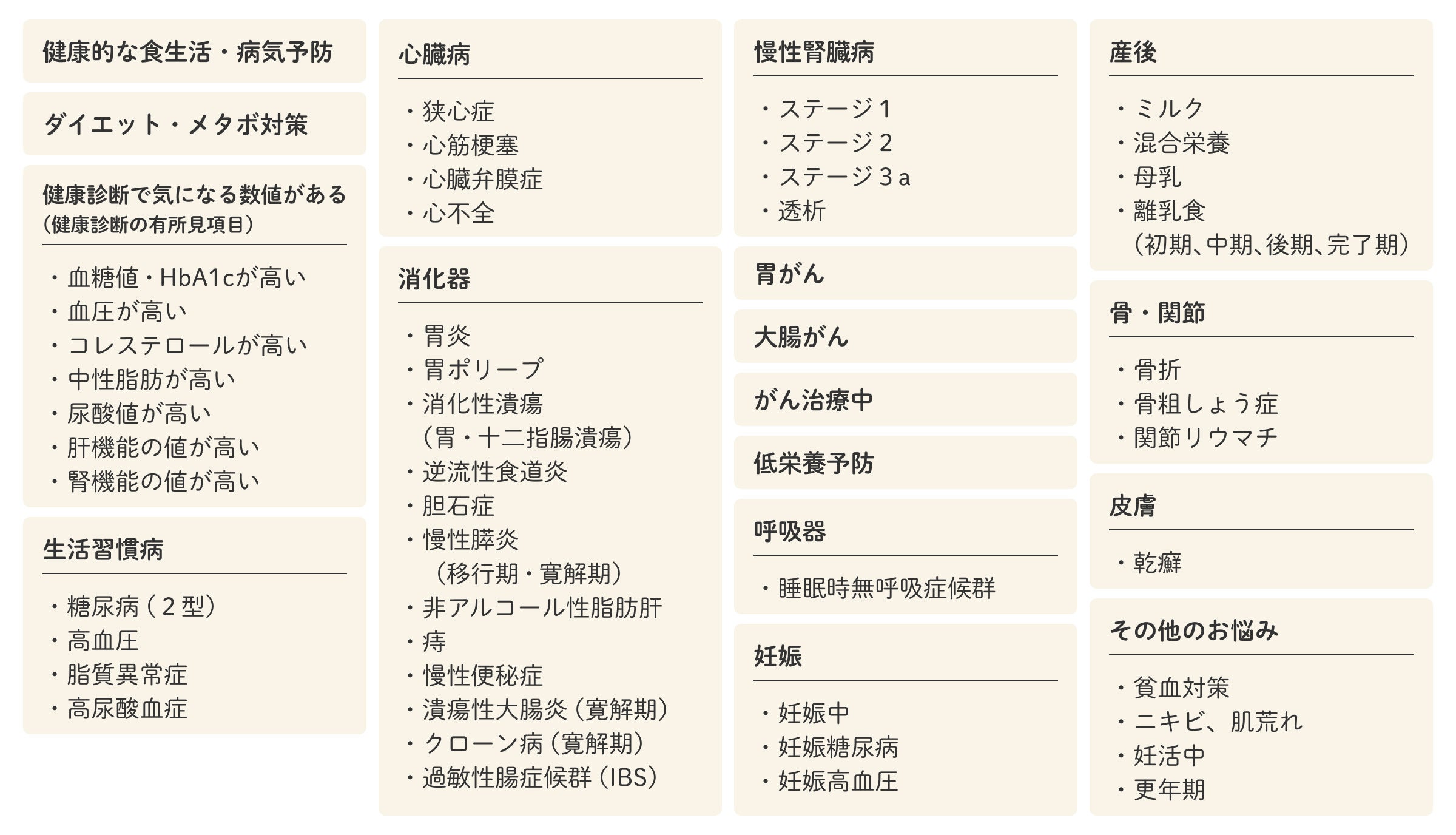 現在、計73種類の健康テーマ・疾患の食事管理支援に対応しております。