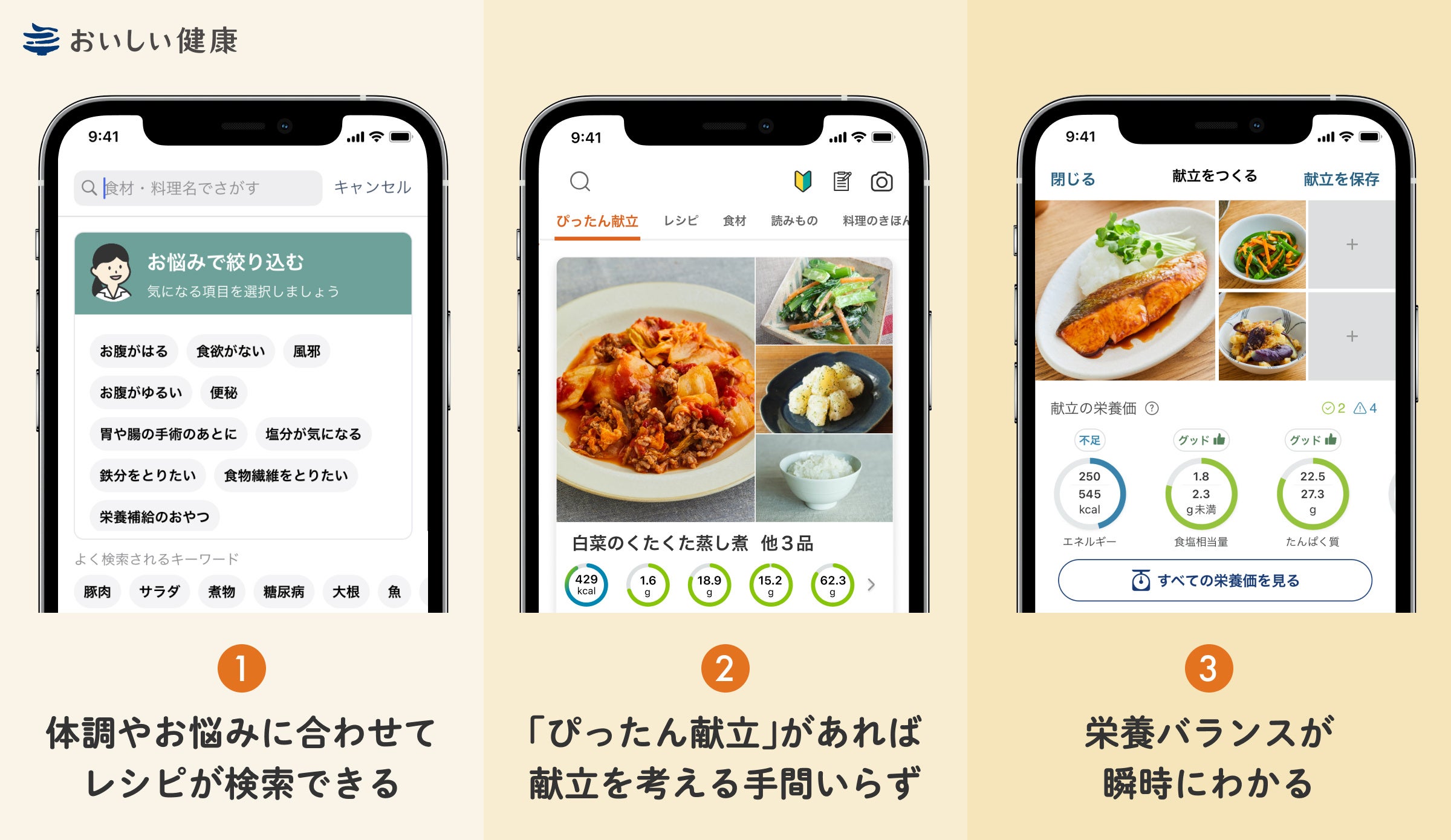 パーソナライズ献立提案・栄養管理支援アプリ『おいしい健康』は、健康な方やダイエット、生活習慣病予備群といった「予防・自己実現のための食事」から、患者や妊婦・高齢者など「医療上の制限がある方の食事」まで、エビデンスに基づく食事管理を、毎日の家庭でおいしく手軽に実践できるよう、サポートいたします。『おいしい健康』では、難しい食事管理をどなたでも簡単に行えるように、一般的なレシピアプリのような使い勝手で実現。個々のユーザーに適した栄養バランスに加え、冷蔵庫の食材や好きな食べもの、料理の腕前や調理時間に合わせた献立を提案する「究極の食のパーソナライズ」を実現し、予防や疾患治療の支援、ひいては「食とデータによる医療費抑制とQOL向上の両立」という社会課題解決を目指します。