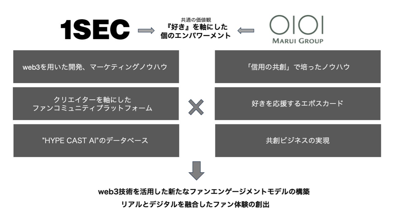 web3の開発、マーケティングノウハウ並びにブロックチェーン技術を活用したファンプラットフォームを展開し蓄積されたデータベースやコミュニティ運営のノウハウを持つ1SECの強みと、丸井グループの小売・フィンテック・未来投資の三位一体のビジネスを掛け合わせ、丸井グループが掲げる「インパクト」の一つ、「一人ひとりの『好き』 を応援」をテーマに展開する新しいファンエンゲージメントモデル構築の共創を推進いたします。