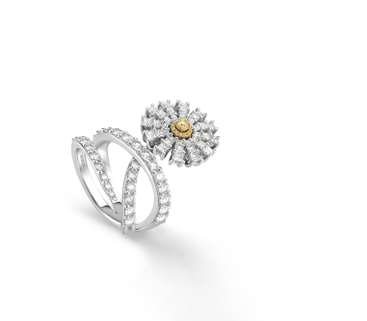 ホワイトゴールドとイエローゴールド、ファンシーイエローダイヤモンドからなるエレガントなマーガレットに、ラウンドカット、プリンセスカットのダイヤモンド合計3.10カラットをあしらった魅力的なリング。
