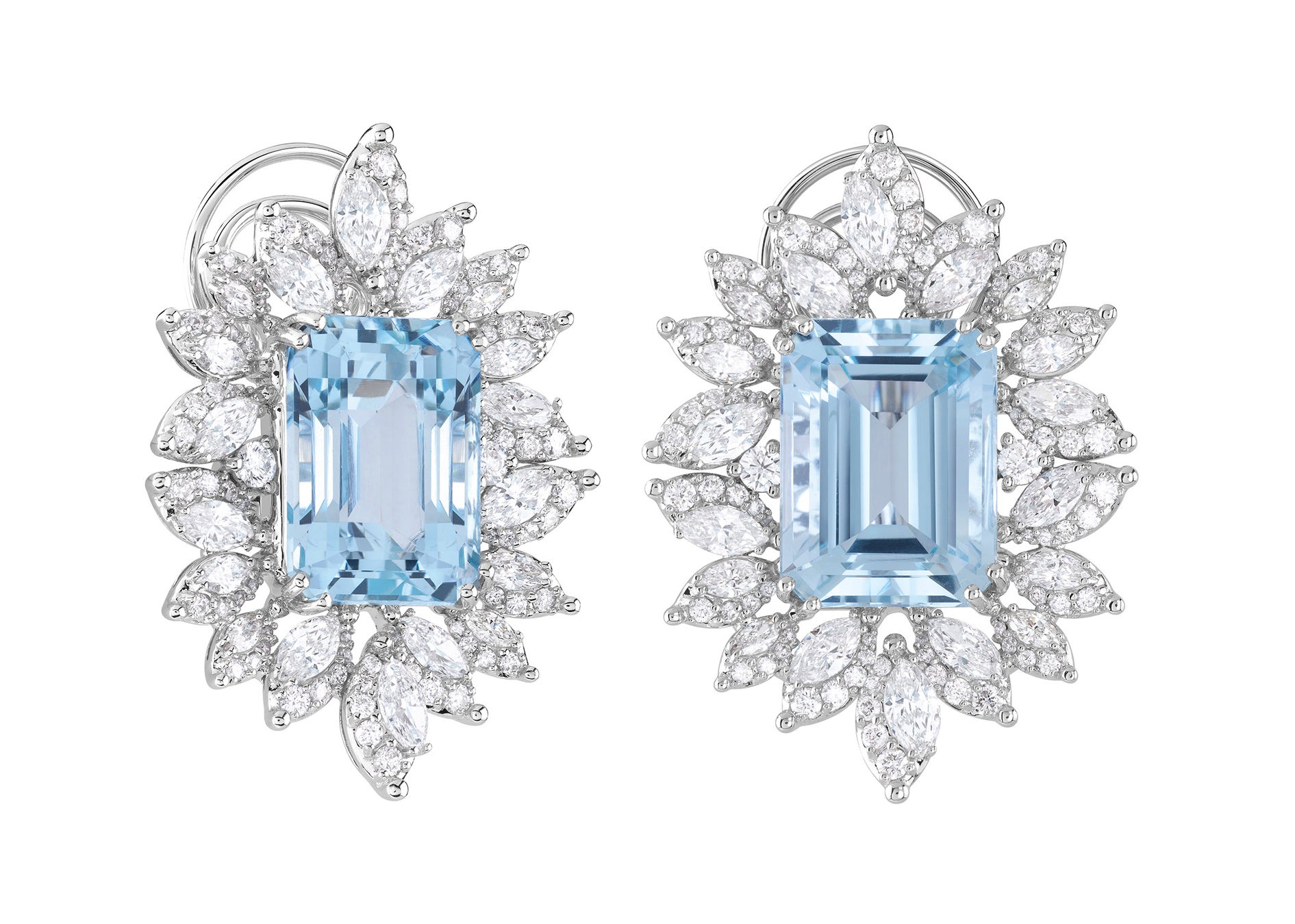 エメラルドカットの美しい合計20.75カラットのアクアマリンを、マーキスカットとブリリアントカットのダイヤモンド合計5.62カラットで飾った壮麗なホワイトゴールドのピアス。