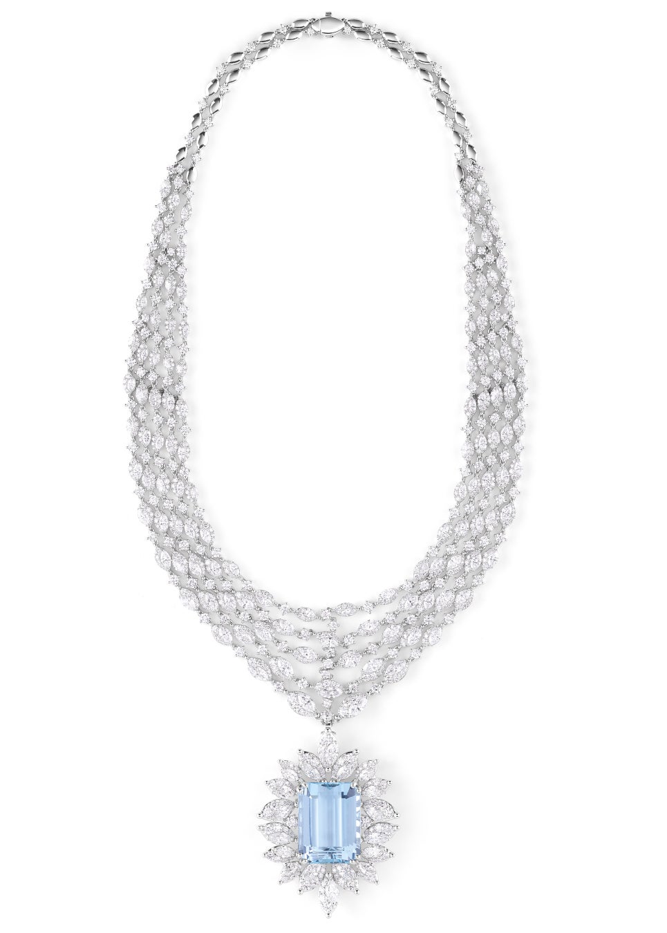 27.69カラットの豪華なアクアマリンをあしらったホワイトゴールドのネックレス。ネックレスにはマーキスカットとブリリアントカットのダイヤモンド合計33.20カラットがあしらわれており、ペンダントはスタイリッシュなブローチとしてもお楽しみいただけます。