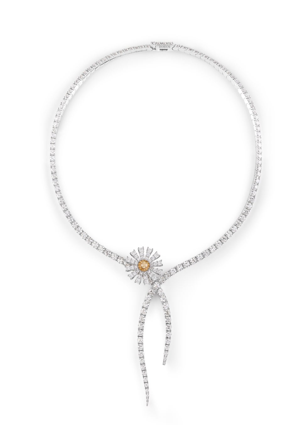 ホワイトゴールドとイエローゴールド、ファンシーイエローダイヤモンドからなる繊細なマーガレットに、ラウンドカット、プリンセスカットのダイヤモンドをあしらった合計23.43カラットの美しいネックレス。