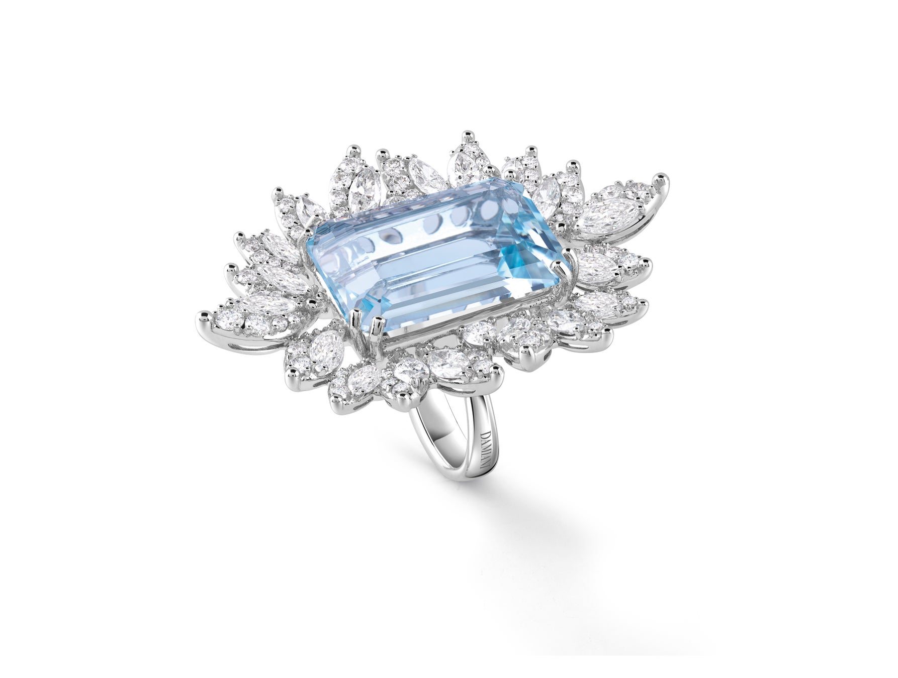 エメラルドカットの美しい23.82カラットのアクアマリンを、マーキスカットとブリリアントカットのダイヤモンド合計5.77カラットが包み込むホワイトゴールドのリング。