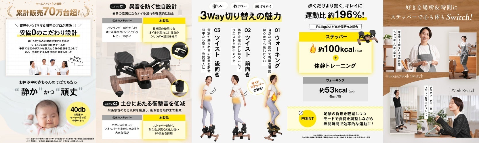 子どもを寝かしつけながらでも安心して運動できる、冷蔵庫のモーター音(約40db)ほどの徹底した静音性と安定性を兼ね備えた「STEADYツイストステッパー」を2025年7月4日(金)より発売。切り替え式の3WAYモードで豊富な運動バリエーションを持ち、インテリアに自然と馴染む木目調デザインを採用した本製品は、子育て中のママや足腰に負担を掛けず運動習慣を身につけたいシニア世代にオススメのこだわりの逸品です。