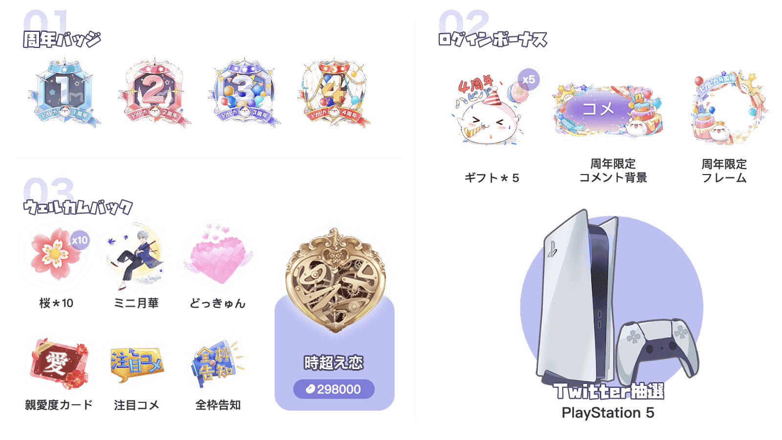 毎日ログインすると、4周年記念ギフトアイテムやコメント背景、限定フレーム、PlayStation5をかけたTwitter抽選権など、沢山の特典を貰うことができます。プレミアムの購入をすると一気に累計ログイン*25の達成となる。