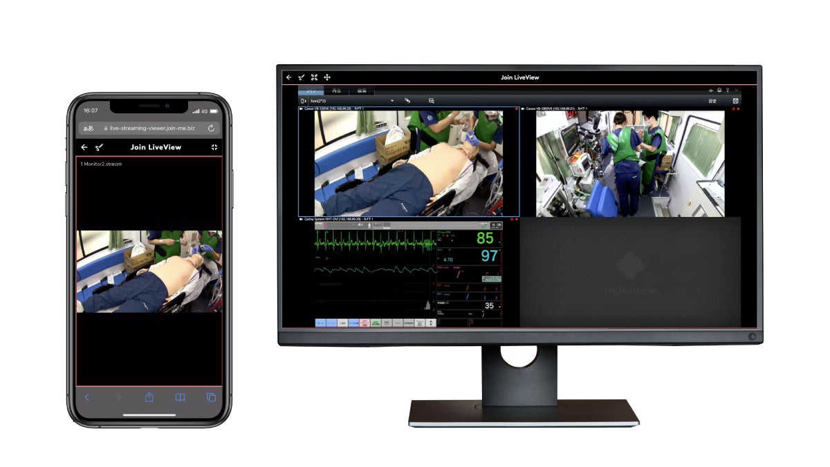 この度の導入では、フクダ電子株式会社(東京都文京区)のECMOカー車載映像サーバーとJoinを連携することで、日本医科大学付属病院のECMOカーに搭載している生体情報モニターや車載カメラの映像を、映像ライブ配信機能のJoin LiveViewを活用し、高セキュリティ環境下で遠隔地から確認することができるようになりました。