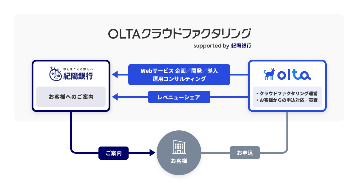 OLTAと紀陽銀行のクラウドファクタリング事業における提携では、OLTAがWebサービスの企画・開発・導入および運用におけるコンサルティングを紀陽銀行に提供し、紀陽銀行は自社ブランドの金融商品のサービスラインナップに加え、法人・個人事業主のお客様にご案内します。