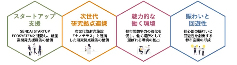 地下1階・地上19階建、地上1階から4階がオフィスサポートフロア、5階から19階をオフィスフロアとし、オフィスサポートフロアの1階から4階では、ワークスペースだけでなく、「交流」や「共創」「イノベーション」をテーマにした多様な機能を備えます。当施設では“スタートアップ支援”、“次世代研究拠点連携”、“魅力的な働く環境創出”、“賑わいと回遊性の向上”の4つを活動の軸と定め、次世代放射光施設※と連携した高機能オフィスビル、街の賑わい創出に貢献する低層部の計画を通じて、周辺地域のさらなる活性化と魅力ある街づくりを進めていきます。